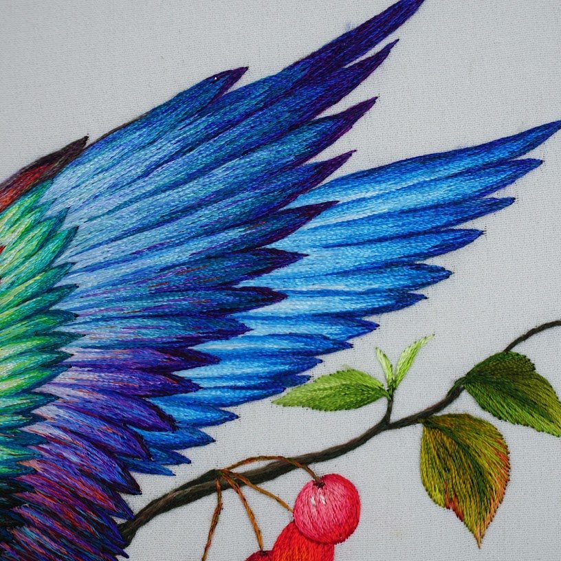 Về mặt kỹ thuật, bức tranh thêu tay này là một minh chứng cho sự khéo léo và tài hoa của người thợ thêu. Từng đường kim, mũi chỉ đều được thực hiện một cách tỉ mỉ, chính xác, tạo nên những chi tiết sắc nét và chân thực. Kỹ thuật thêu nổi bật với những lớp chỉ đan xen tinh tế đã mang đến hiệu ứng chiều sâu và chân thực cho tác phẩm, làm cho chú vẹt như đang nhảy ra khỏi khung tranh để chu du trong không gian.