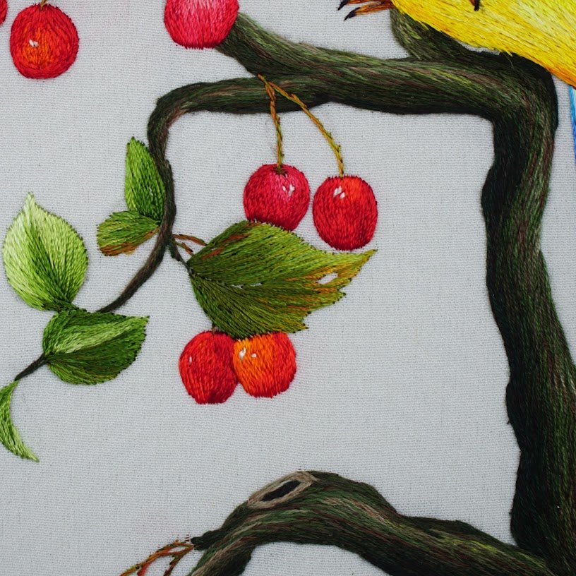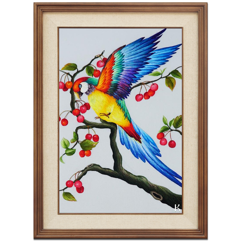 Bức tranh là một tác phẩm nghệ thuật đầy tính cảm hứng, không chỉ bởi vẻ đẹp hình thức mà còn bởi tinh thần mà nó mang lại. Chú vẹt đứng trên một cành cây xanh tươi với những quả mọng đỏ chín, tượng trưng cho sự sinh sôi, nảy nở và may mắn. Hình ảnh này không chỉ gợi nhớ đến vẻ đẹp của thiên nhiên mà còn là biểu tượng cho sự cân bằng và hạnh phúc trong cuộc sống, theo phong thuỷ, đây cũng là một hình ảnh mang lại tài lộc và bình an cho gia đình.