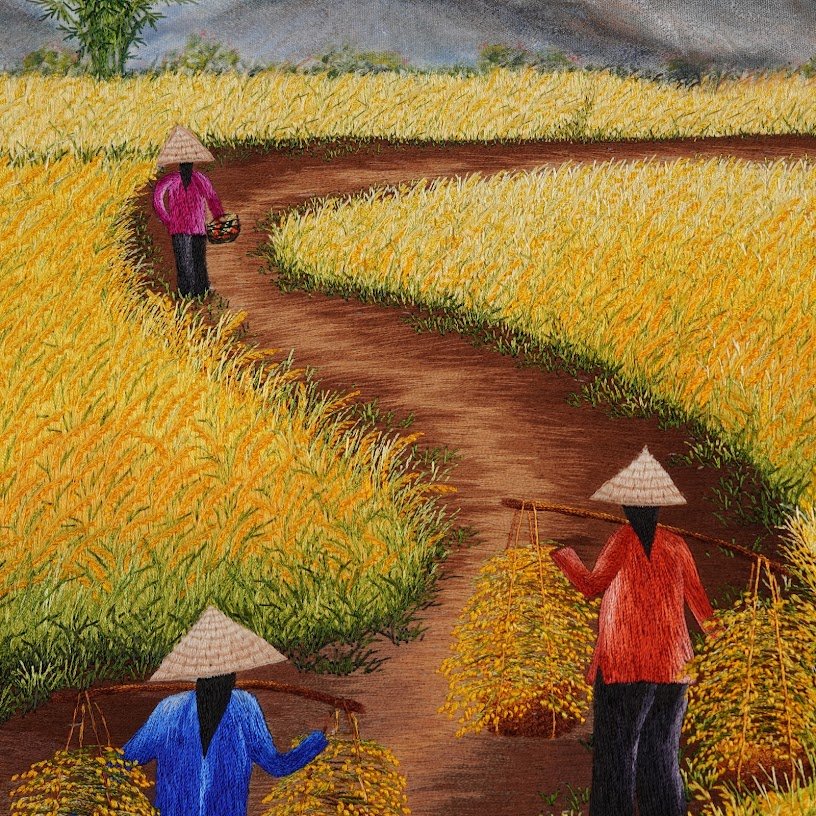 Tranh thêu tay Phong Cảnh Quê Hương ngay lập tức gây ấn tượng với người xem bởi bức tranh dẫn dắt vào thế giới thôn quê thân thuộc. Khung cảnh đồng lúa vàng óng, trải dài đến chân trời, tạo cảm giác bao la, mênh mông và bình yên đáng kể. Sắc vàng hiện lên rực rỡ, tương phản trên nền trời xanh ngát cùng những đám mây bồng bềnh như đang nhảy múa. Gắn liền với đó là hình ảnh những người nông dân cần mẫn làm việc, dáng vẻ chăm chỉ, quần áo nhuộm màu trời giúp hòa quyện vào cảnh trí xung quanh.