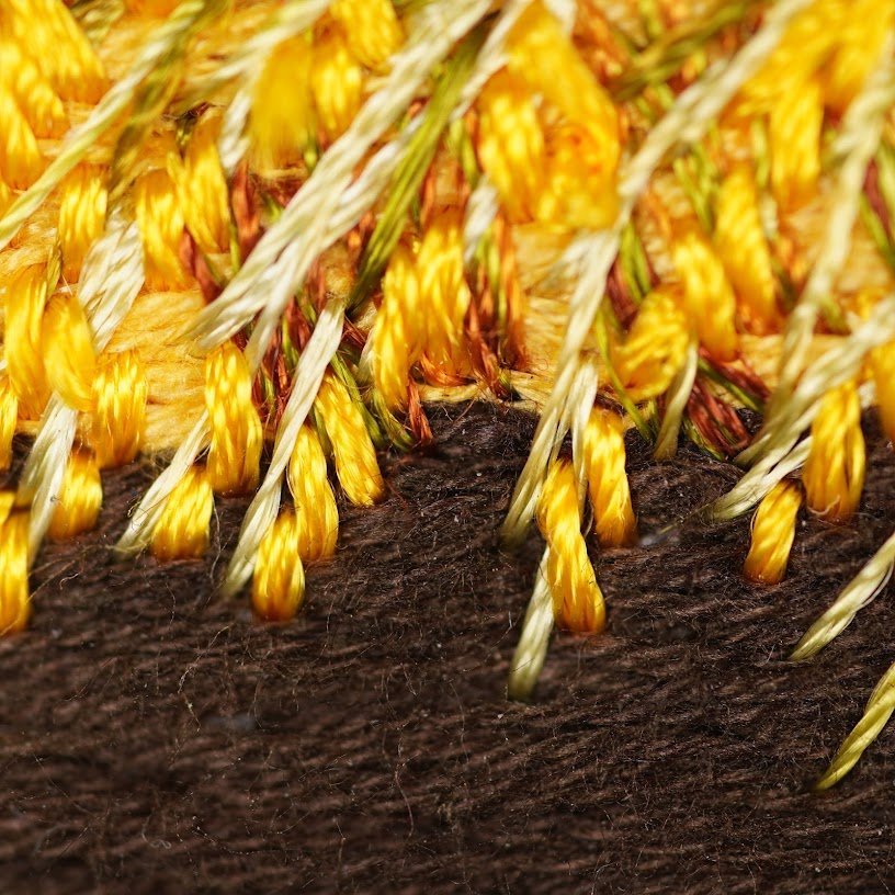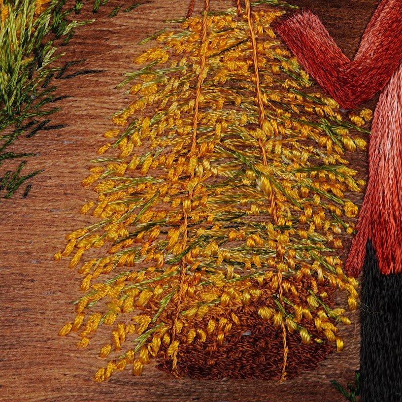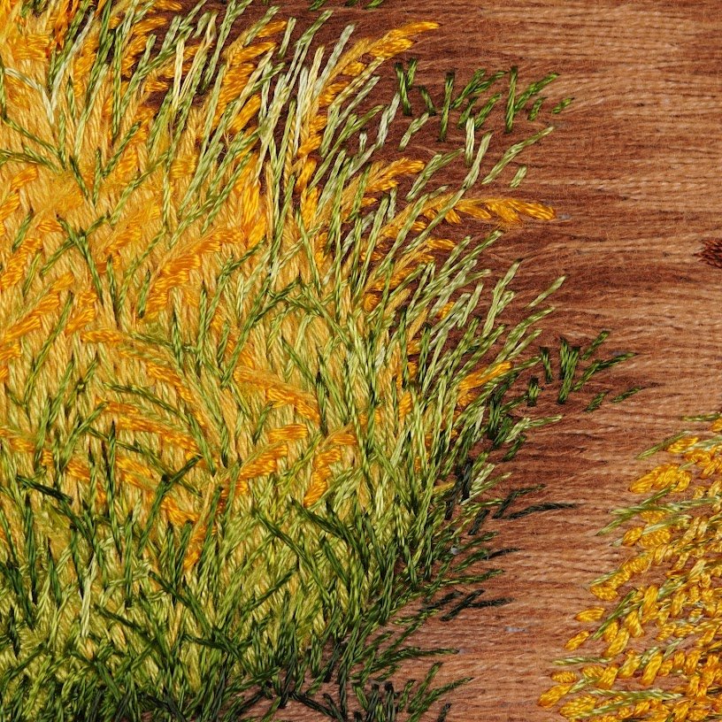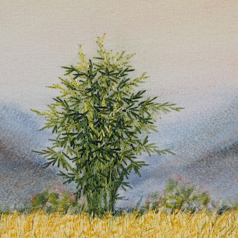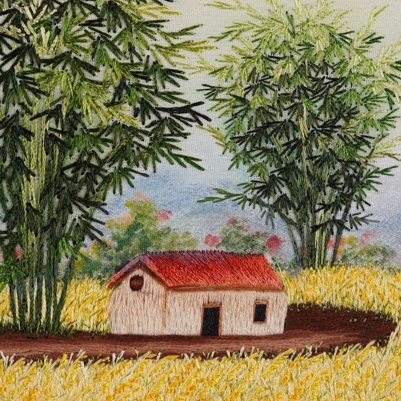 Nổi bật trên bức tranh là những cây tre xanh rì rào, biểu tượng của làng quê Việt Nam, một lần nữa khẳng định sự bình yên và vững chãi. Chúng đứng vững bên cạnh con đường uốn lượn, dẫn dắt ánh nhìn của người xem men theo vòng cung nhẹ nhàng, trải qua những dải lúa vàng mềm mại. Cách thêu tỉ mỉ, từng mũi chỉ được sắp xếp công phu tạo nên hiệu ứng thị giác như các lớp màu vẽ sơn dầu của tranh họa sĩ, mang lại chiều sâu và sự sống động cho tác phẩm.