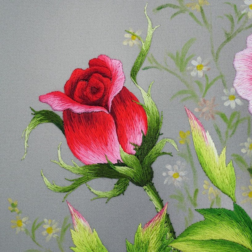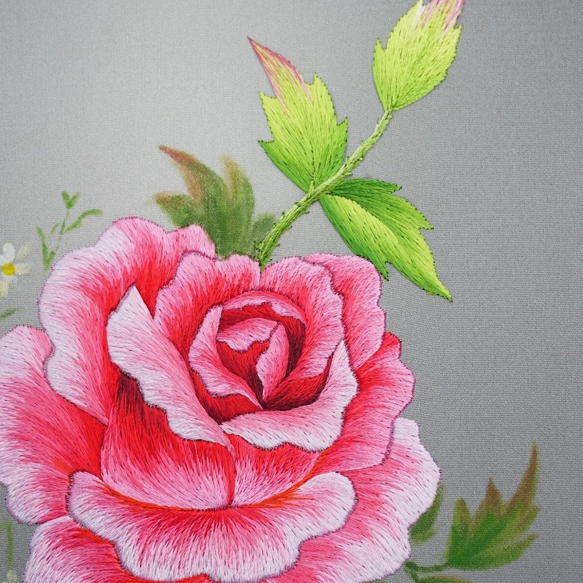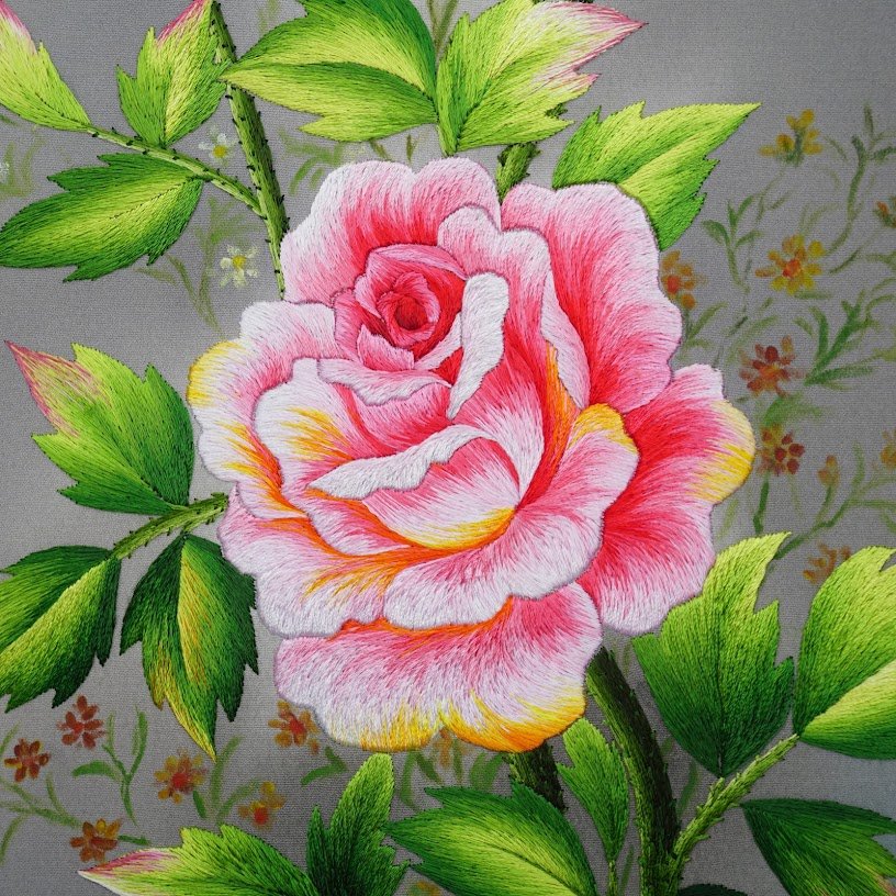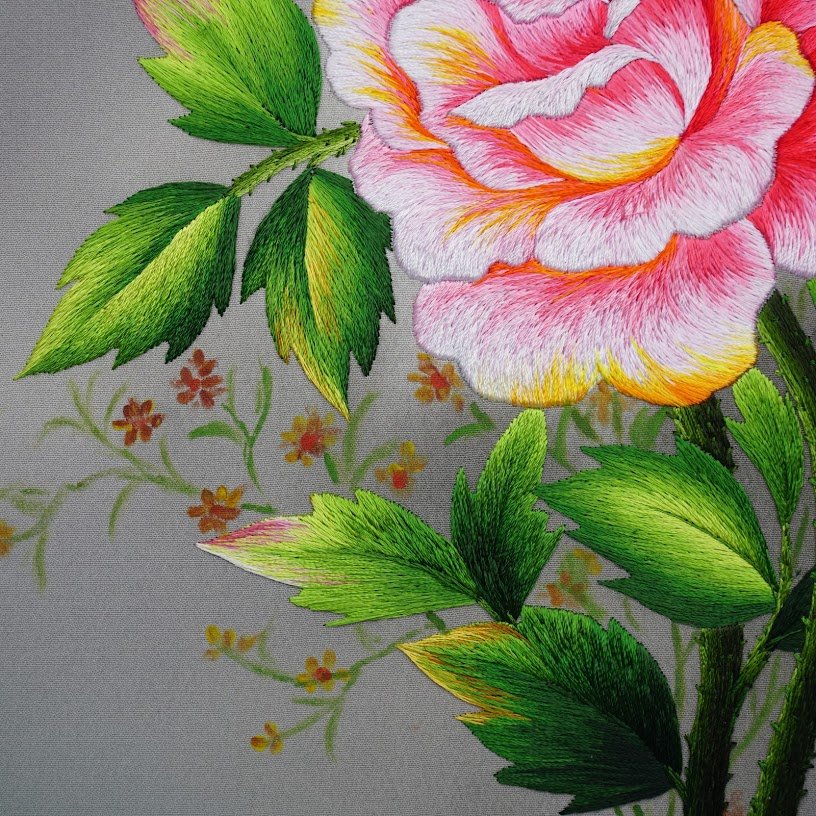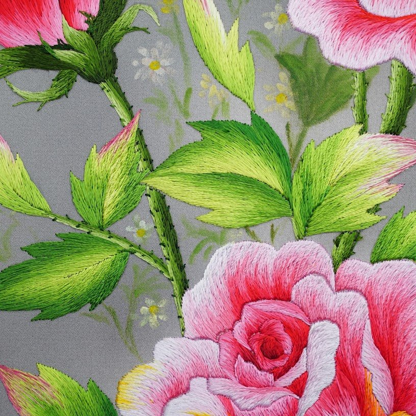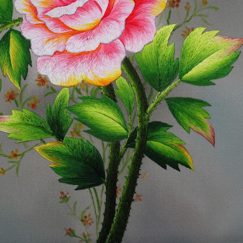 Khi chiêm ngưỡng bức tranh, ta sẽ thấy được sự hòa quyện tài tình giữa nghệ thuật thêu tay truyền thống và sắc thái hội họa hiện đại. Trên nền vải màu xám nhạt, những đóa hoa hồng nổi bật với sắc hồng tươi thắm, mềm mại như thể chính những cánh hoa đang vươn mình khỏi mặt tranh. Những lá xanh mướt chen chúc xung quanh, tạo thành một vòng tay ôm trọn lấy sức sống mãnh liệt từ những đóa hoa. Kỹ thuật thêu tay điêu luyện thể hiện rõ qua từng đường kim mũi chỉ, sắc nét và tinh tế, không thể nhầm lẫn với bất kỳ sản phẩm công nghiệp nào.