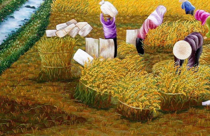 Trên bức tranh thêu tay “Mùa Bội Thu – Khơi Gợi Cảm Hứng Mùa Vàng Bội Thu”, hình ảnh mùa gặt vàng óng hiện lên sống động và chân thực đến từng chi tiết nhỏ nhất. Giá trị của bức tranh không chỉ nằm trong nghệ thuật thêu kỳ công mà còn ở thông điệp và sâu sắc mà nó mang đến cho người xem. Ngắm nhìn bức tranh, ta như được hòa mình vào không khí rộn ràng của mùa gặt, chạm tới từng nhịp thở và tâm hồn của những người nông dân cần cù, chất phác.