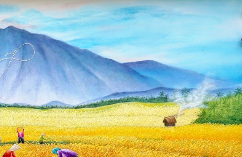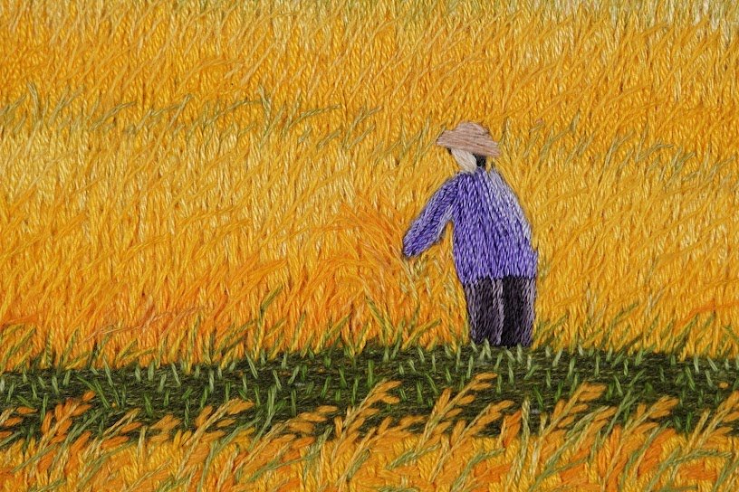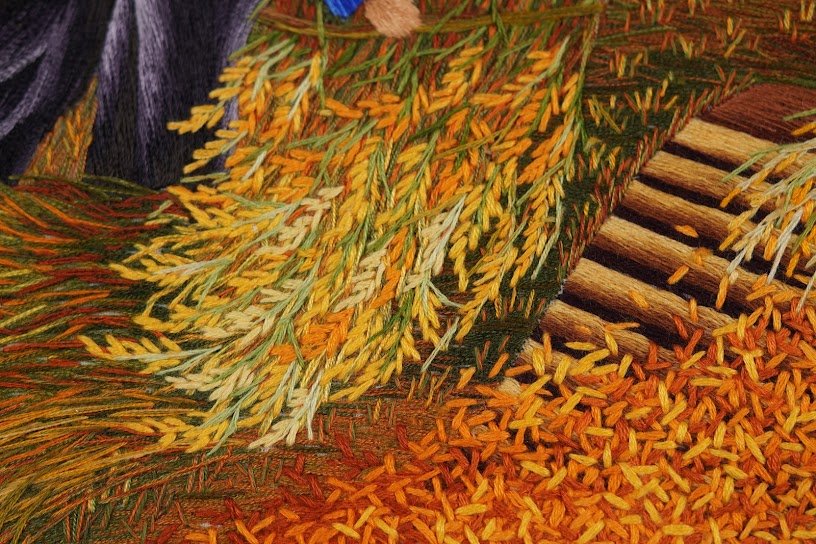 Đặc biệt, từng chi tiết trong bức tranh được thêu tay tỉ mỉ, từ từng chiếc nón lá, từng bó lúa gặt, đến cả những đường nét mềm mại của dòng kênh chảy ngang qua cánh đồng. Khả năng bắt ánh sáng và bóng tối làm cho cảnh vật trong tranh trở nên vô cùng chân thực. Đằng sau hình ảnh núi non xa xa, mây trời xanh ngắt, từng chi tiết đó đưa người xem vào một không gian bao la nhưng đầy ấm áp, như một cái ôm dịu dàng của đất mẹ.