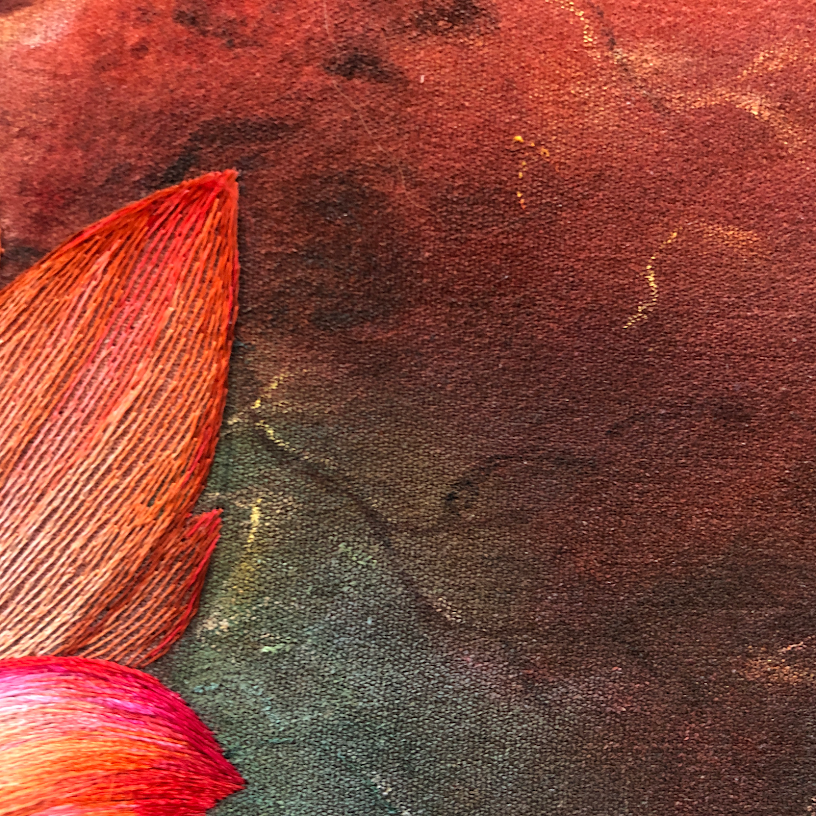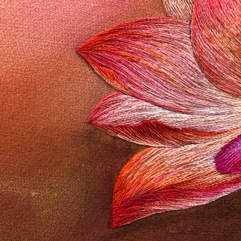 Thoạt nhìn vào bức tranh, ta dễ dàng bị cuốn hút bởi hoa sen – biểu tượng của sự thanh khiết và giác ngộ trong triết lý Phật giáo. Qua bàn tay tài hoa của người thợ thêu, hình ảnh bông sen hiện lên sinh động và cực kỳ chi tiết. Những cánh hoa được thêu thủ công tỉ mỉ, từ sắc hồng nhạt chuyển dần sang hồng đậm với điểm nhấn vàng, tạo nên một tổng thể rất tự nhiên và chân thực.