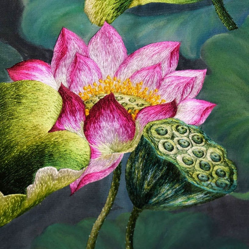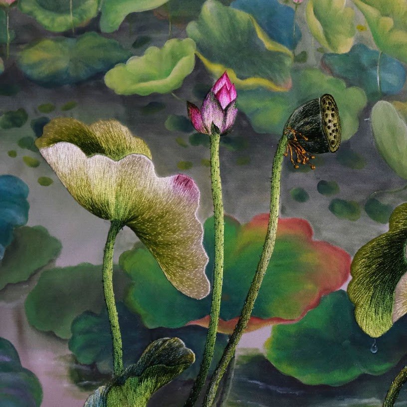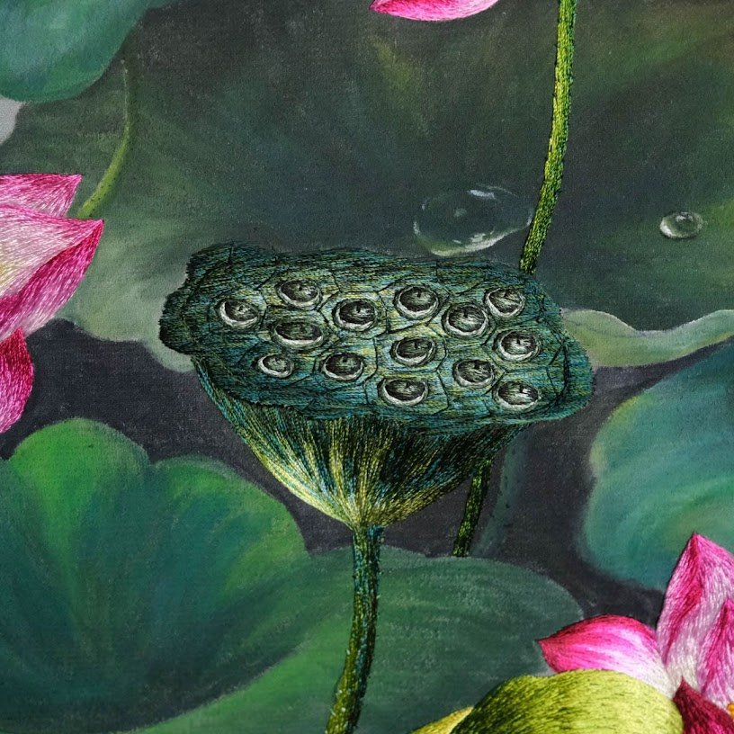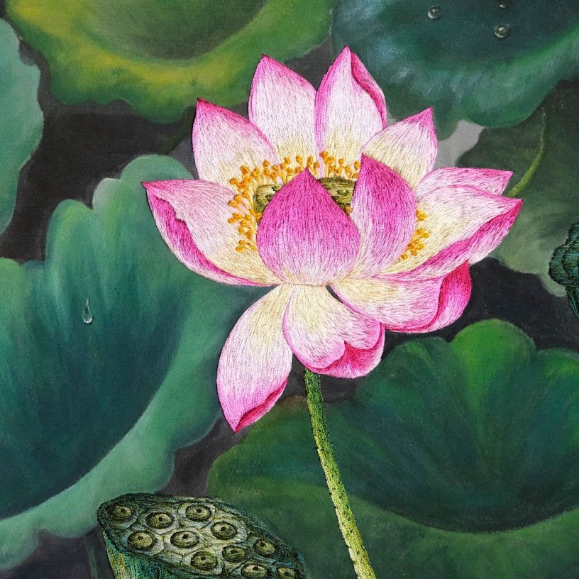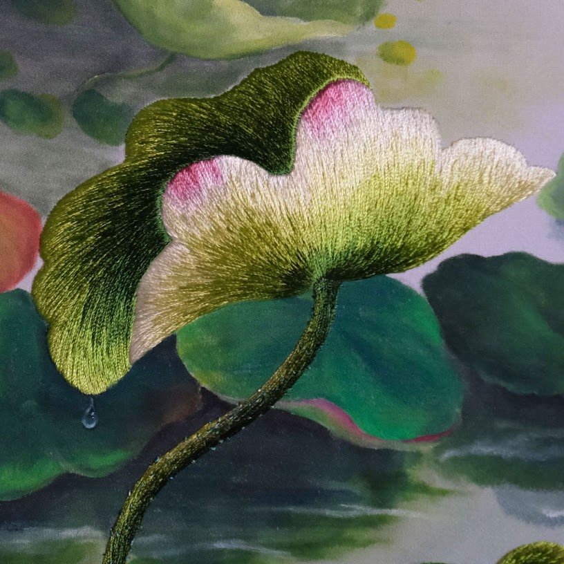 của bức tranh được sắp xếp rất tinh tế. Những bông hoa sen không chỉ nằm rải rác mà còn xen kẽ giữa những lá lớn nhỏ, tạo nên một hình ảnh tựa như bức tranh phong cảnh sống động. Mỗi đường kim mũi chỉ đều được điều chỉnh cẩn thận, tạo nên hiệu ứng ánh sáng tự nhiên, khiến bức tranh không chỉ đơn thuần là một tác phẩm thêu mà còn giống như một bức họa thực sự.