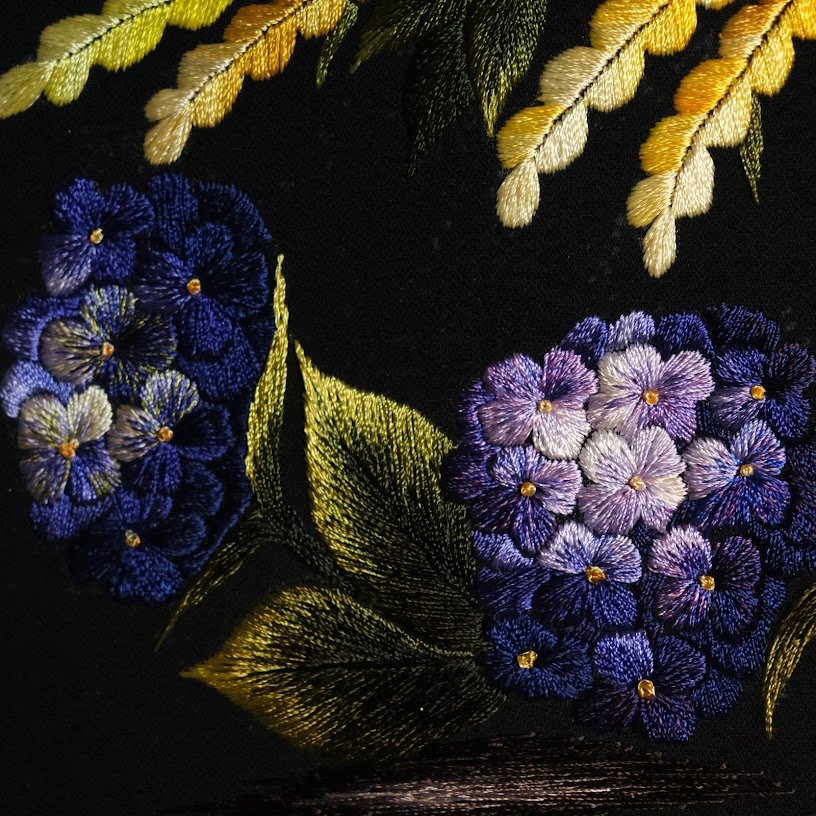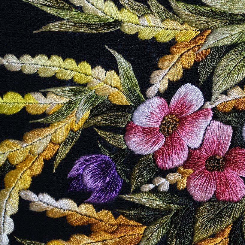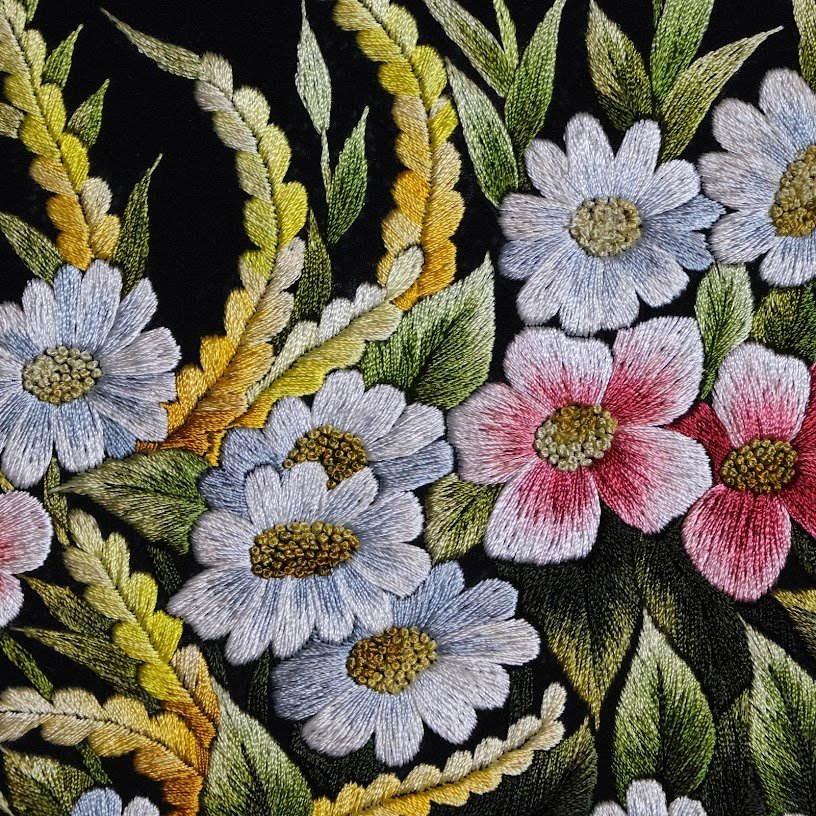 Trên nền vải đen tinh tế, từng nét thêu hiện lên sắc nét, rực rỡ nhưng không kém phần mềm mại. Hình ảnh bình hoa nổi bật, tràn đầy sức sống với sự kết hợp phong phú của nhiều loại hoa đang nở rộ. Những bông hoa cúc trắng thanh khiết, hòa quyện cùng những đóa hoa màu hồng dịu dàng, sắc tím mộng mơ và màu vàng ấm áp, tất cả cùng tạo nên một bảng màu đầy cảm xúc. Ánh sáng trong tranh được thể hiện một cách tài tình, khiến cho từng cánh hoa như đang bừng sáng nổi bật trên nền tối.