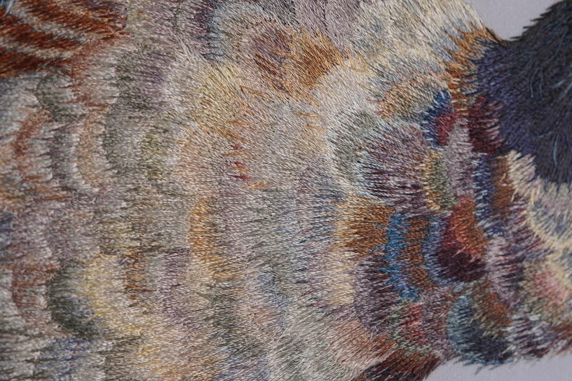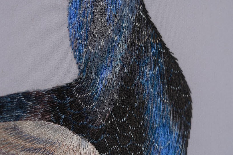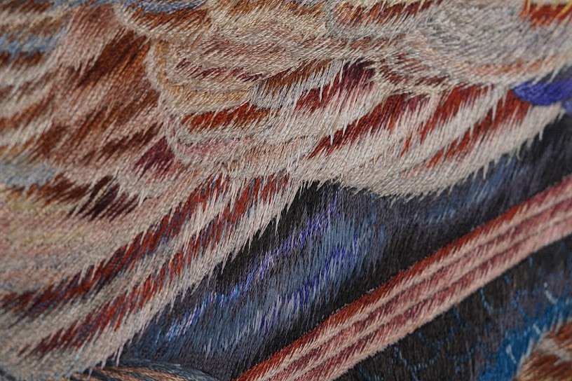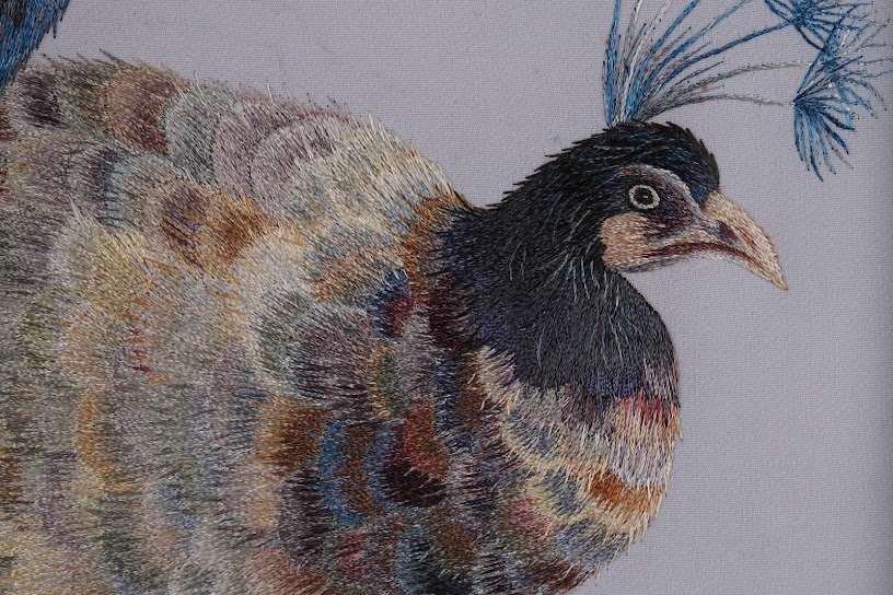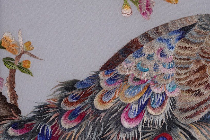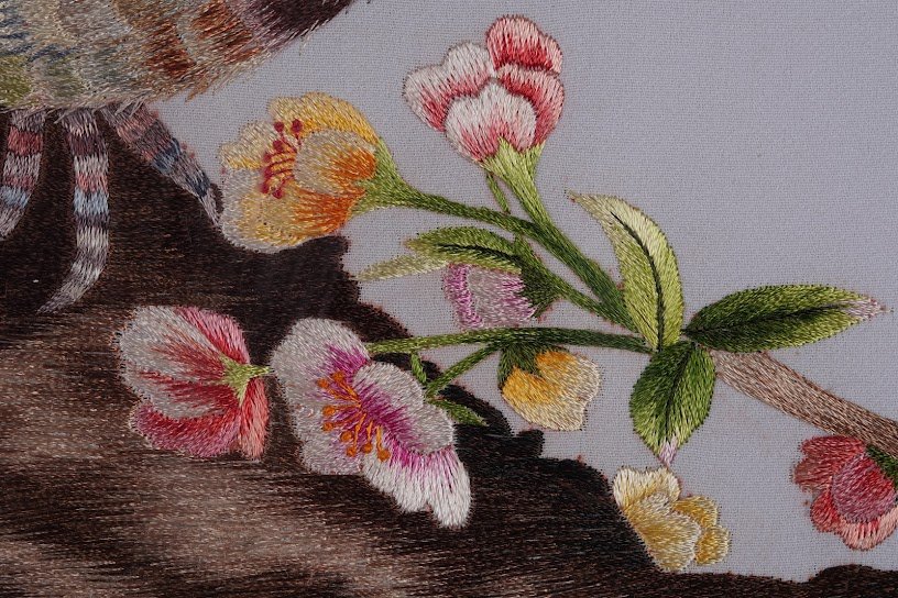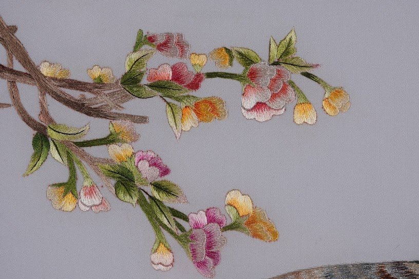 Bức tranh này còn ghi dấu ấn bởi phông nền tĩnh lặng với những sắc hoa đào nhẹ nhàng, tinh tế, tăng thêm phần lãng mạn và thanh thoát cho tổng thể. Cành cây nghiêng mình, điểm thêm bông hoa nhỏ, như để tôn lên vẻ đẹp kiều diễm của loài chim quý. Đây không chỉ là một tác phẩm để ngắm nhìn, mà còn là một câu chuyện tự nhiên được kể bằng những đường kim mũi chỉ tinh hoa.