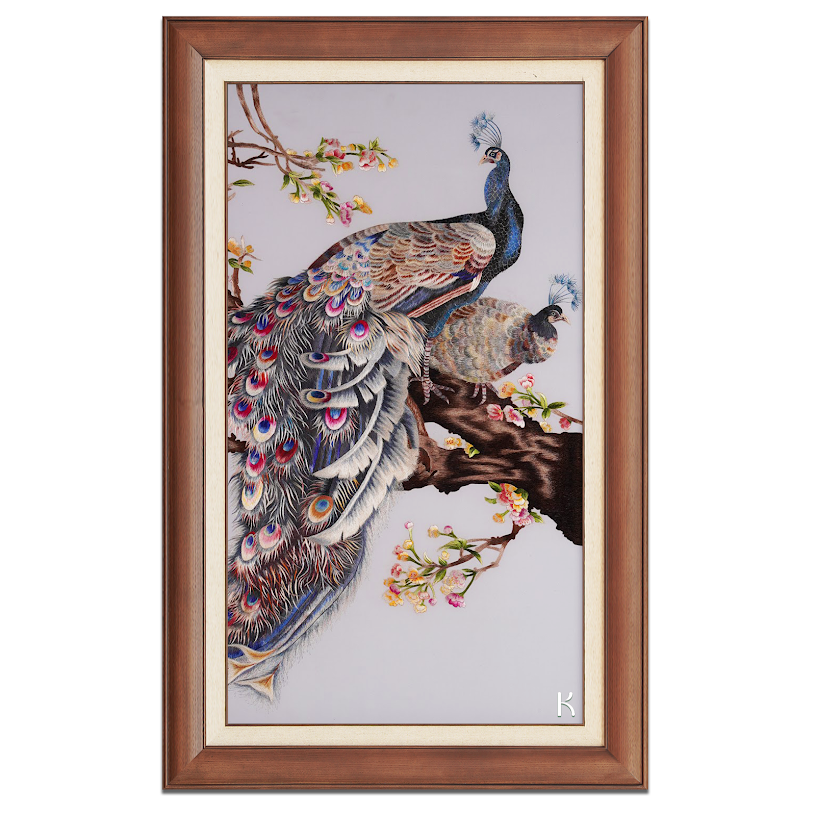 Bức tranh hiện diện hai chú công đứng kiêu hãnh trên những cành cây hoa. Sự kết hợp giữa những chi tiết chấm phá và gam màu tự nhiên đã làm nên một bức tranh thêu đầy sống động. Màu xanh dương trên nền lông công chuyển dần thành sắc đỏ, sắc vàng, tạo nên hiệu ứng thị giác đầy cuốn hút, giống như một bản hòa tấu màu sắc tinh tế, hài hòa.