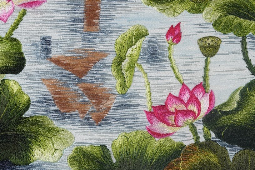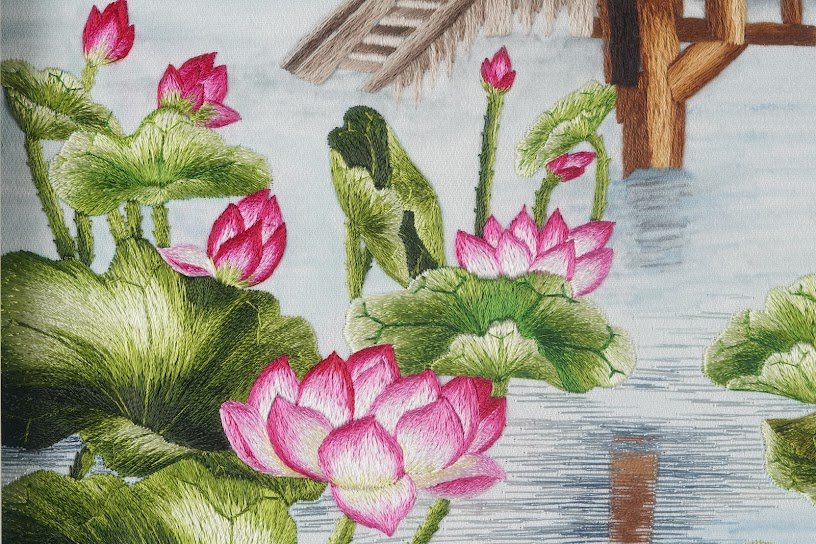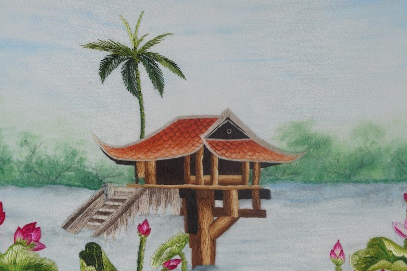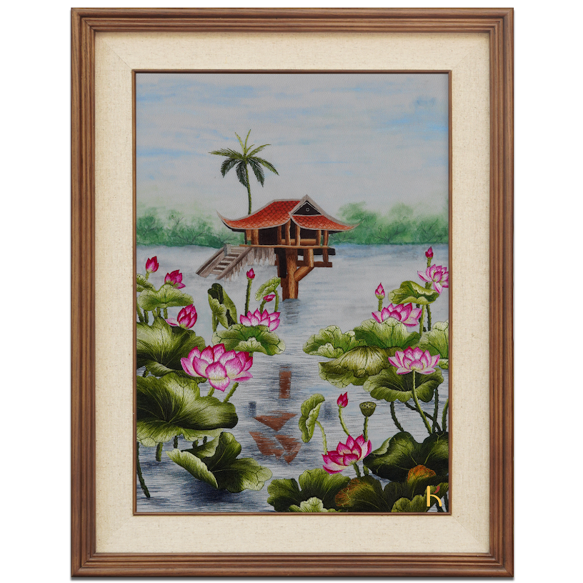 Điều gì khiến bức tranh này trở nên đặc biệt đến vậy? Có lẽ chính là ở sự kết hợp hoàn hảo giữa nghệ thuật thêu tay truyền thống và mỹ thuật hội họa. Màu sắc trong tranh tươi sáng nhưng không phô trương, tạo nên một tổng thể hài hòa, thấm đượm nét dịu dàng của phong cảnh Việt. Từng cánh hoa sen được thêu nổi bật giữa nền xanh dịu dàng tạo điểm nhấn tuyệt đẹp, làm sống dậy không gian sống thường nhật của chúng ta.