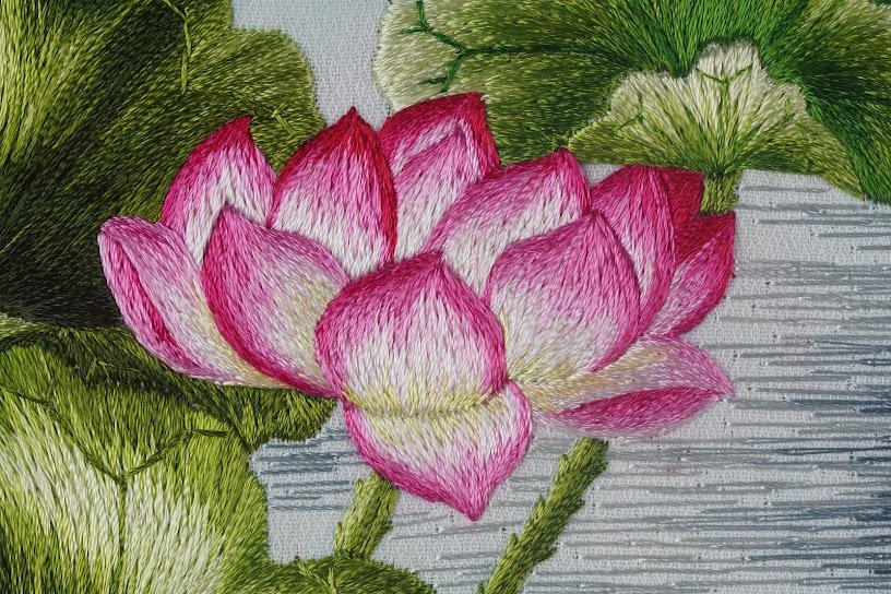 Chất liệu của bức tranh là vải lụa mềm mại, kết hợp với kỹ thuật thêu tỉ mỉ thể hiện sự kỳ công của nghệ nhân. Từ những chi tiết nhỏ nhất như gợn sóng lăn tăn trên mặt nước, từng chiếc lá sen xanh tươi, tất cả đều được thêu tay một cách cẩn trọng, toát lên vẻ chân thực và đầy sức sống. Gần như không có đường kim mũi chỉ nào là thừa thãi, mỗi chi tiết đều góp phần làm nên một tác phẩm hoàn chỉnh và có hồn.