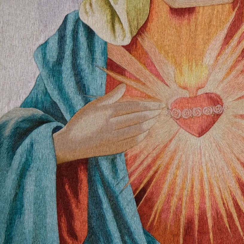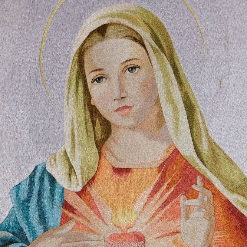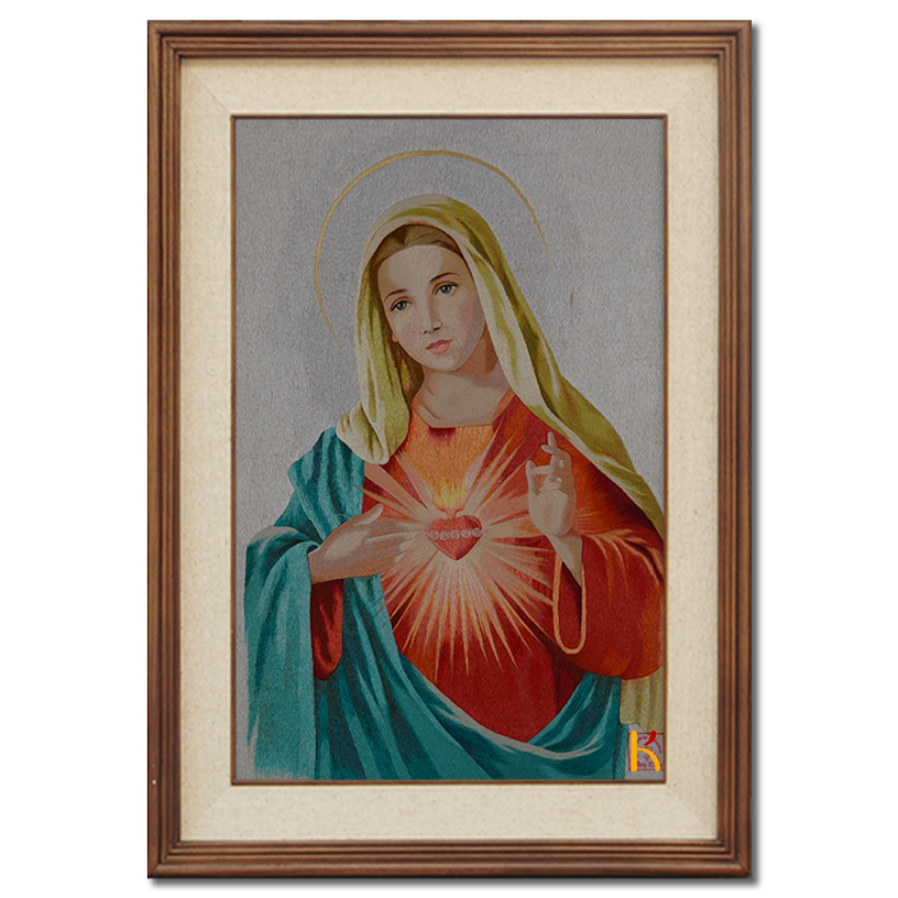 Khi nhìn sâu vào từng chi tiết, chúng ta thấy được sự khéo léo của thợ thêu. Mỗi đường kim như đang nhảy múa trên bề mặt vải, tạo nên một bức tranh sống động với các chi tiết cực kỳ tinh tế. Đường nét mềm mại của khuôn mặt Đức Mẹ được thể hiện qua kỹ thuật di kim tỉ mỉ, tạo nên ánh nhìn đầy từ bi và lòng khoan dung. Ánh sáng được thêu khéo léo quanh quả tim Đức Mẹ, tựa như một ngọn lửa tình yêu bất diệt, lan tỏa sức mạnh của lòng tin và hy vọng.