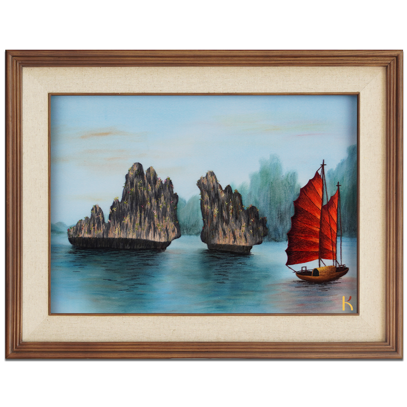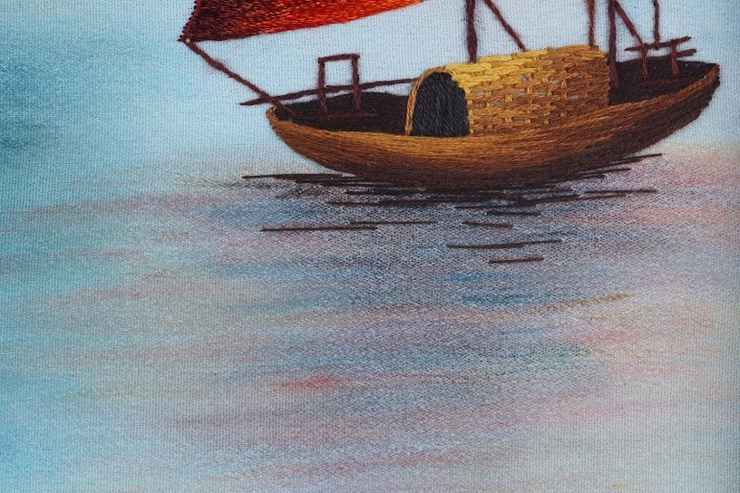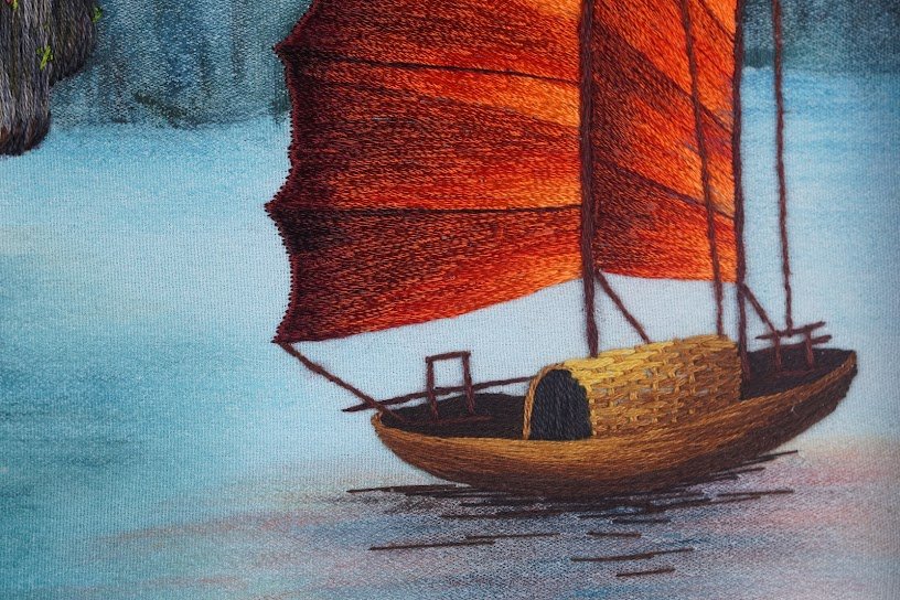 Bức tranh thêu này đặc biệt ở chỗ nó không chỉ là kết quả của sự khéo léo trong việc lựa chọn màu sắc mà còn là minh chứng cho tài năng và tâm huyết của nghệ nhân. Màu xanh của bầu trời và nước biển hòa quyện cùng sắc đỏ rực rỡ của cánh buồm, tạo nên một bức tranh sống động nhưng không kém phần mềm mại. Từng mũi kim chạm vào tấm vải đều chứa đựng sự cẩn thận và tâm hồn của người thợ, làm nổi bật lên từng chi tiết nhỏ nhất.
