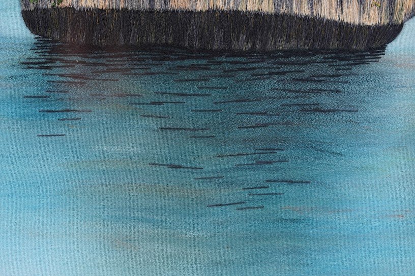 Những chi tiết nhỏ nhặt trong bức tranh khiến người xem không thể rời mắt. Từ những vệt rêu phong xanh ngắt trên mặt đá đến sự chuyển động nhẹ nhàng của cánh buồm dưới làn gió nhẹ đều được tái hiện một cách tinh tế. Nền trời thanh khiết, mặt nước yên ả tô điểm cho cảnh vật thêm phần sống động và chân thật, như đang kể câu chuyện của chính mình.