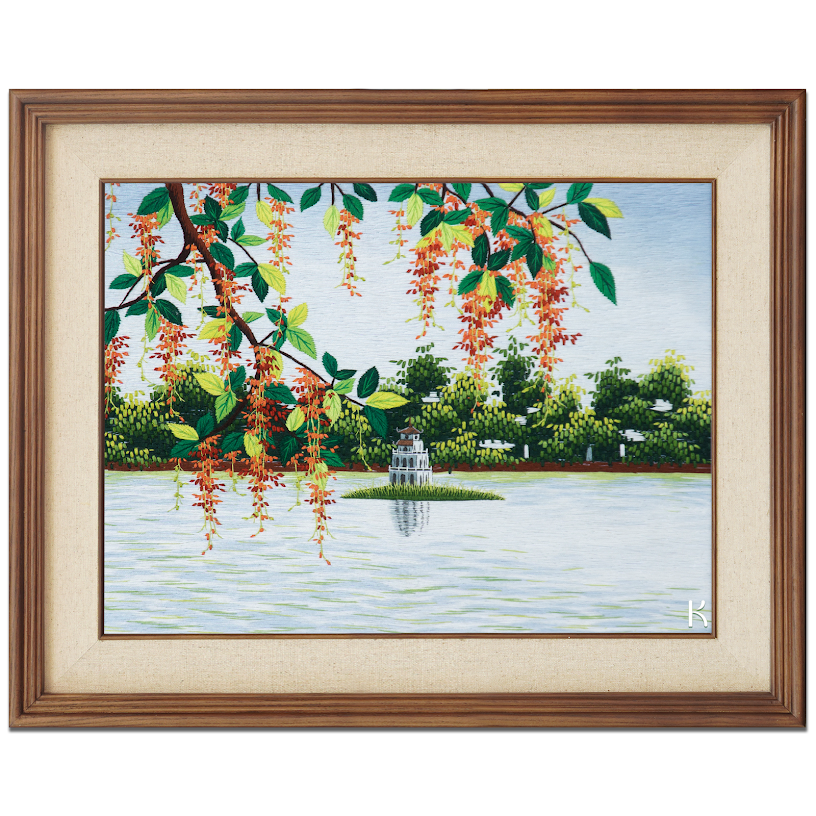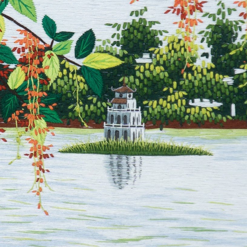 Điểm đặc biệt của bức tranh thêu tay này nằm ở không gian khung cảnh bình yên nhưng không kém phần sống động và cuốn hút. Nhìn vào, ta dễ dàng nhận ra đây là hình ảnh biểu tượng của Hà Nội – nơi giao thoa giữa quá khứ và hiện tại. Cây liễu rủ xanh mướt tỏa bóng xuống mặt nước trong vắt, tạo ra một không khí thanh bình, dịu dàng. Xa xa, tháp Rùa nổi bật trên nền trời xanh – một điểm nhấn không thể thiếu của hồ.