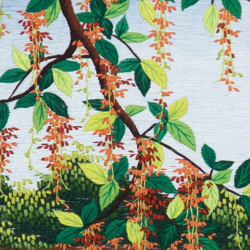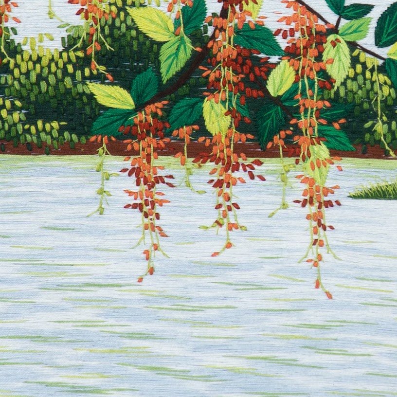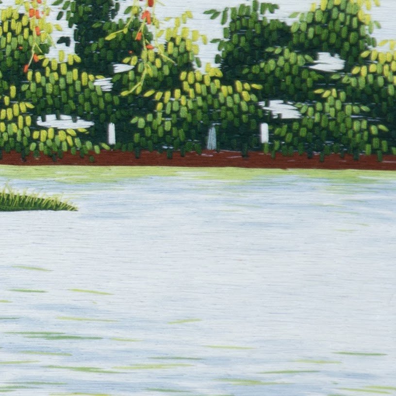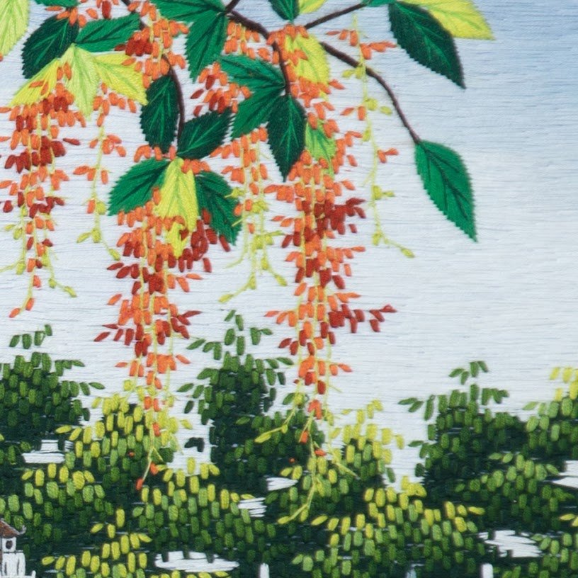 Màu sắc trong bức tranh được phối hợp tuyệt vời với sự cân đối hài hòa giữa sắc xanh của lá cây và mặt nước, xen lẫn vào đó là những mảng màu trầm ấm của thân cây và hoa lá. Những đường thêu mượt mà, tinh tế tạo nên độ sâu và sức hút cho từng chi tiết nhỏ nhất, như thể bất cứ lúc nào bạn cũng có thể thấy làn gió nhẹ lướt qua, lay động những cành lá.