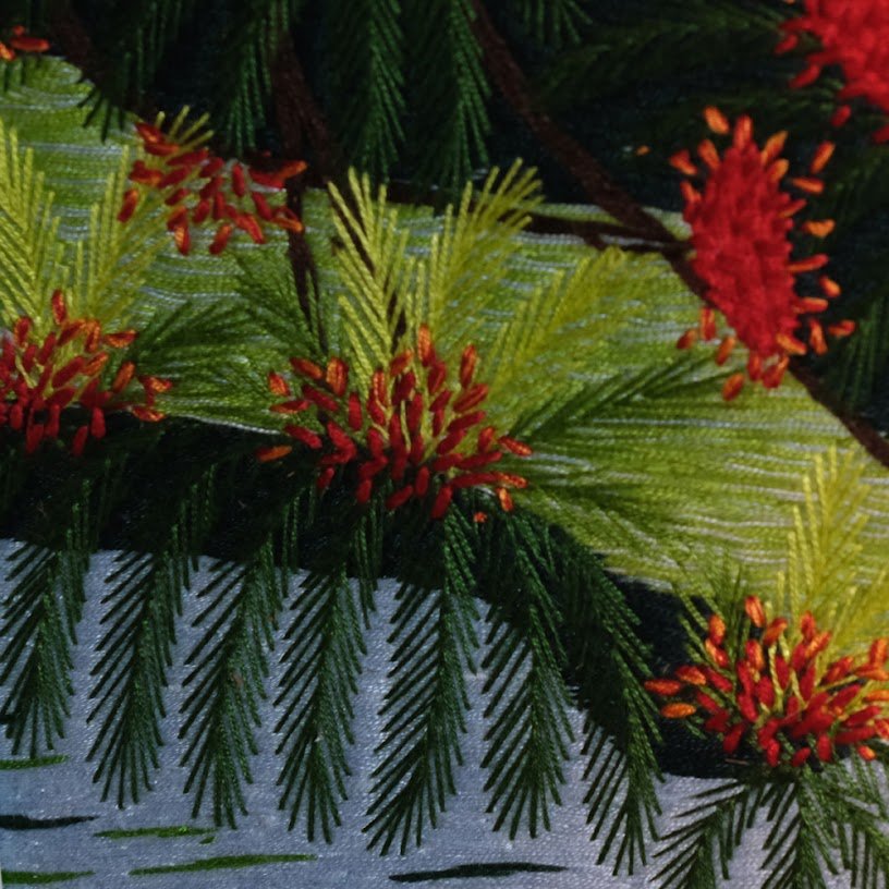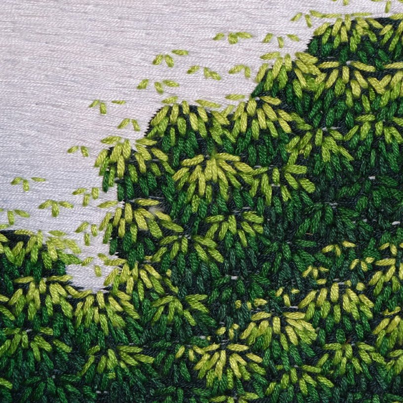 Đi sâu vào chi tiết, kỹ thuật thêu tay vô cùng tỉ mỉ đã giúp tạo nên những dải màu chuyển sắc mềm mại, từ xanh thẳm của lá cây đến sắc trắng nắng vàng trên mặt hồ. Đường kim mũi chỉ được thực hiện cẩn thận, giúp từng chi tiết trở nên sống động và chân thực hơn bao giờ hết. Mỗi chi tiết nhỏ bé trong tranh đều chứa đựng tâm huyết và sự khéo léo của người thợ thêu, để tạo ra một sản phẩm không chỉ đẹp mắt mà còn giàu giá trị nghệ thuật.