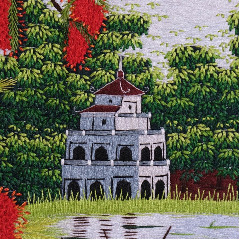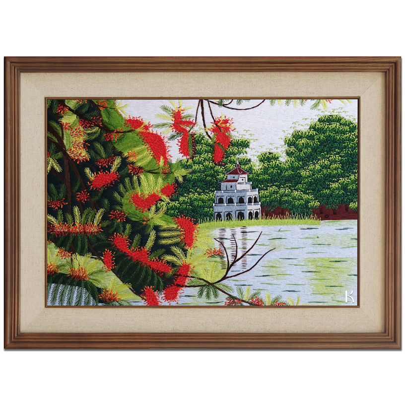 Ngay từ cái nhìn đầu tiên, bức tranh thêu tay về Hồ Gươm đã gây ấn tượng với người xem bởi màu sắc sống động và hài hòa. Nổi bật trên nền xanh ngắt của nước và bầu trời là những tán cây xanh mướt, điểm xuyết sắc đỏ rực rỡ của hoa phượng, tạo nên một cảnh sắc vừa thơ mộng, vừa hùng vĩ. Giữa các mảng màu đó hiện lên Tháp Rùa nhỏ nhắn nhưng đầy vững chãi, như một điểm nhấn đặc trưng và biểu tượng lâu đời của thủ đô Hà Nội.