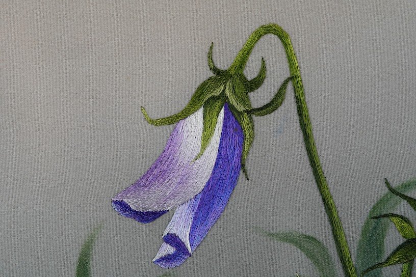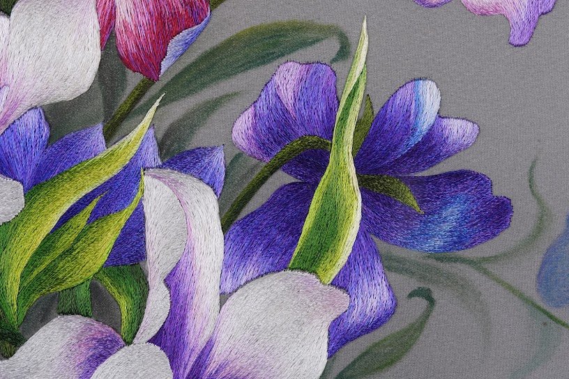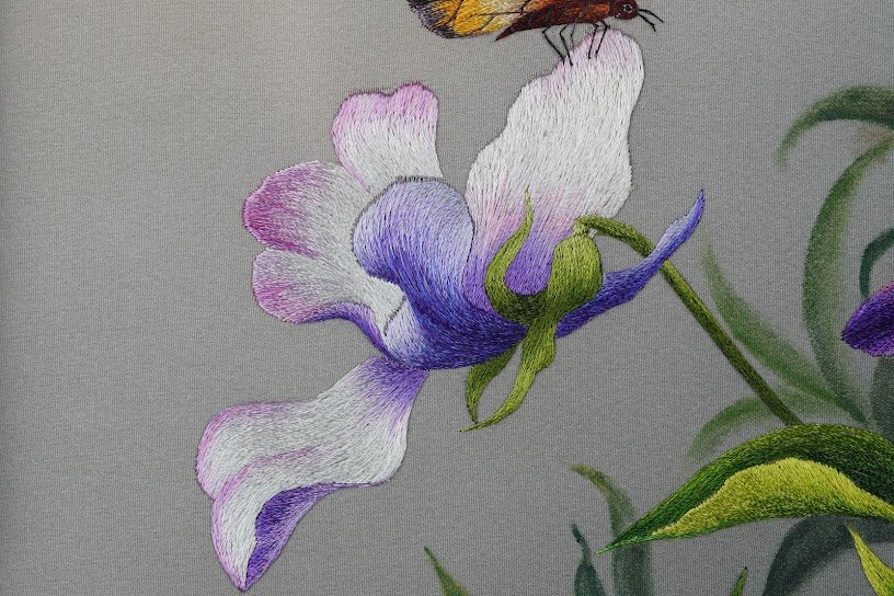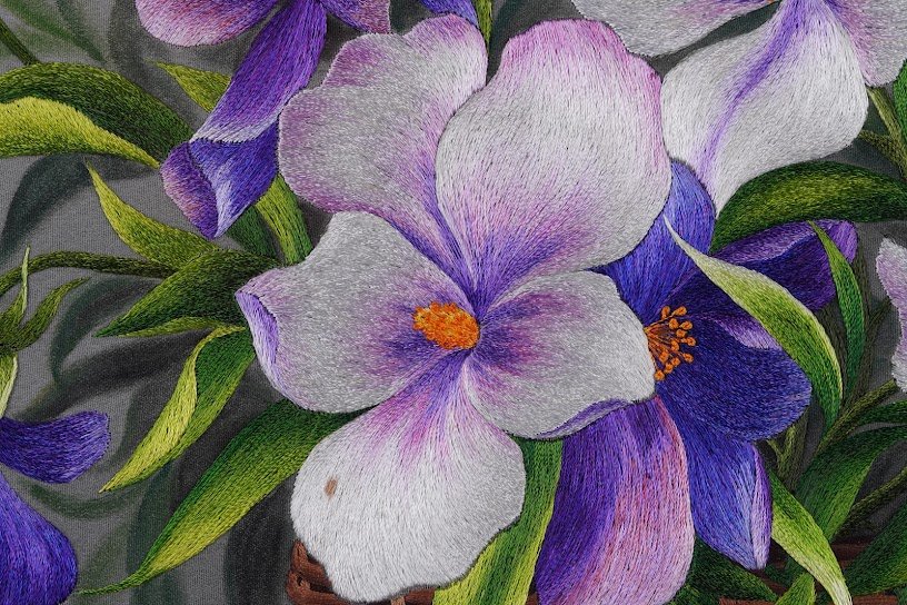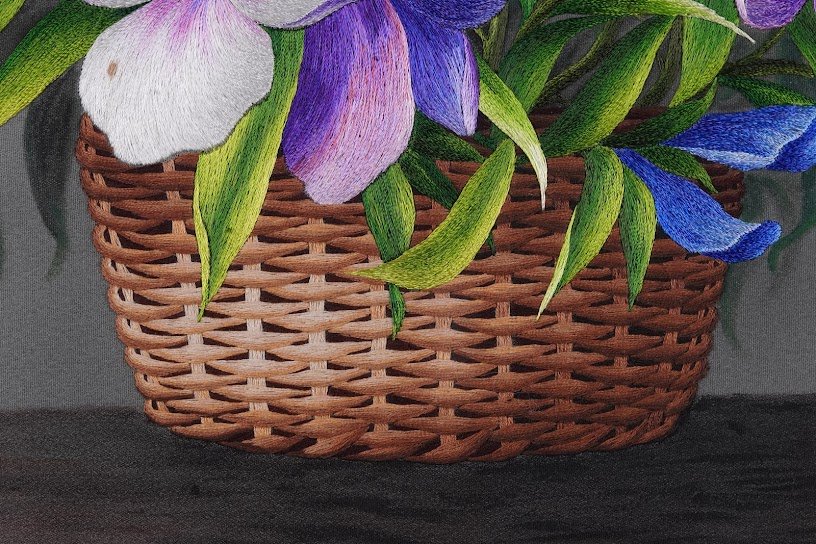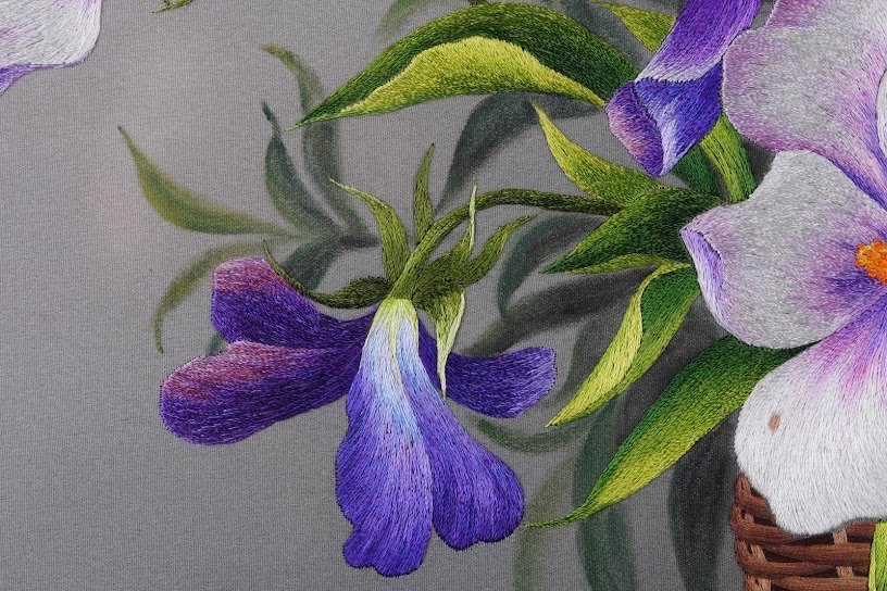 Kỹ thuật thêu tay thể hiện rõ ràng sự tỉ mỉ và tinh xảo, từng mũi thêu uốn lượn theo các cánh hoa, chiếc lá, tạo nên độ chân thực đến bất ngờ. Bức tranh tuy không cầu kỳ về , nhưng mỗi chi tiết đều được hoàn thiện đến mức gần như hoàn hảo, khiến người xem có cảm giác như đang đứng trước một tác phẩm hội họa thực sự. Đó chính là kết quả của sự kết hợp tài tình giữa tay nghề thêu thủ công lâu đời và cái nhìn nghệ thuật sắc sảo.