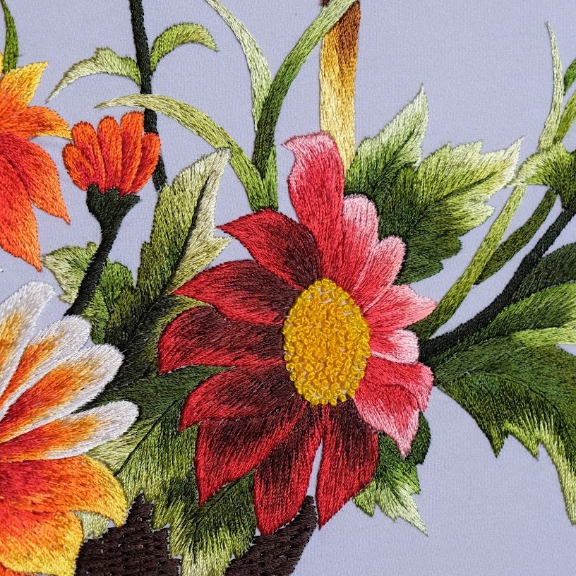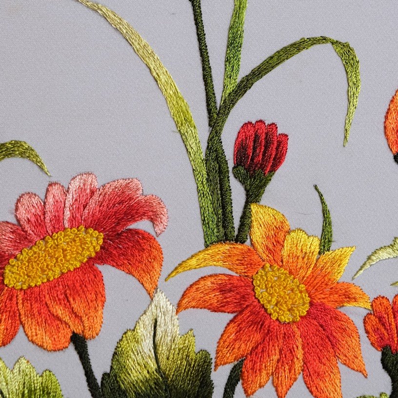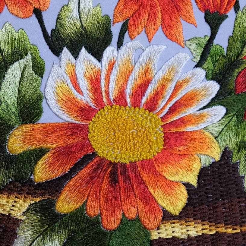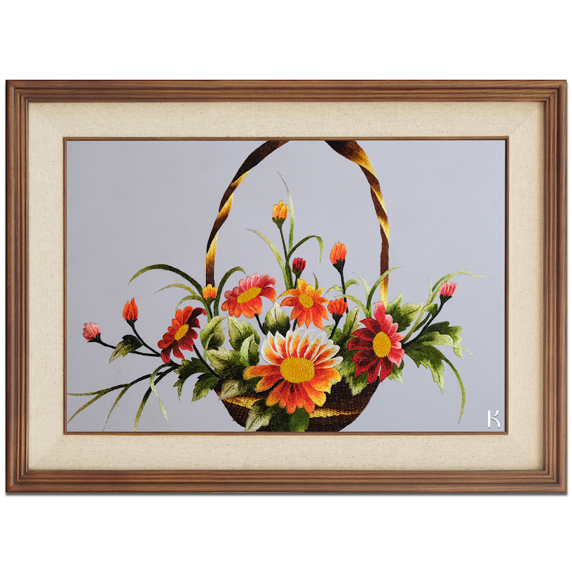 Bức tranh thêu với hoa đồng tiền nổi bật không chỉ bởi sắc hoa rực rỡ mà còn bởi hài hòa và sự tỉ mẩn trong từng mũi thêu. Đặt giữa một không gian yên bình, giỏ hoa đồng tiền như muốn tỏa sáng, hòa nhịp với môi trường xung quanh tạo nên một bức tranh vô cùng sống động và có hồn. Sự kết hợp giữa màu xanh lá của lá và sắc đỏ, cam của cánh hoa tạo nên sự đối lập đầy ấn tượng, như một bức tranh sơn dầu đã được thêu bằng chỉ, làm cho khung cảnh thêm phần tươi mới và cuốn hút.