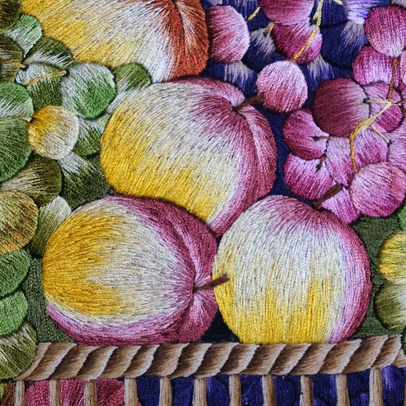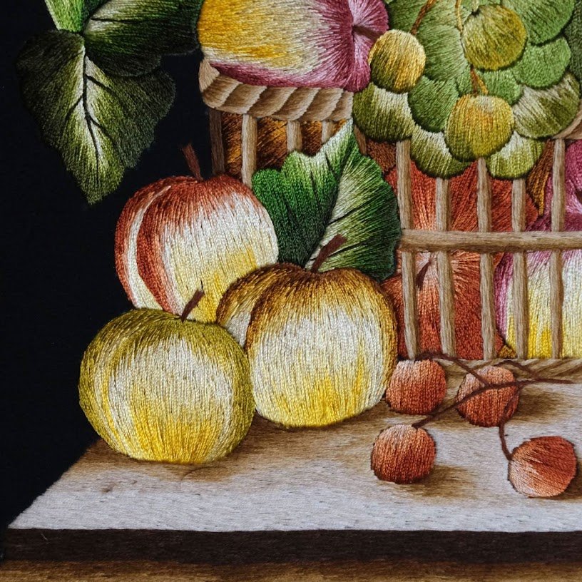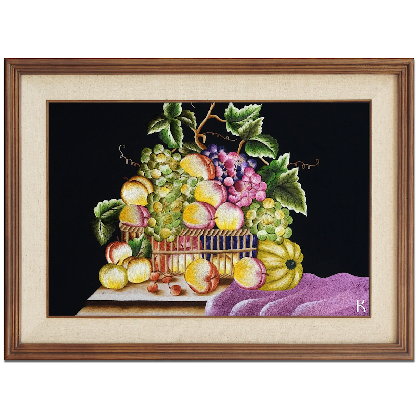 Nhìn sâu hơn vào bức tranh, bạn có thể cảm nhận được kỹ thuật thêu tay vô cùng tinh xảo, nơi mà mỗi sợi chỉ được thêu lên tấm vải như một dòng cảm xúc tuôn trào. Người nghệ nhân như một nhạc trưởng điều khiển từng mũi kim để tạo ra giai điệu hoàn hảo của ánh sáng và bóng tối. Đặc biệt, sự phối hợp nhịp nhàng giữa đường nét mềm mại của từng quả và dáng vẻ cứng cáp của chiếc giỏ đựng mang đến sự cân đối tinh tế, tựa như bài thơ được viết trên nền vải.