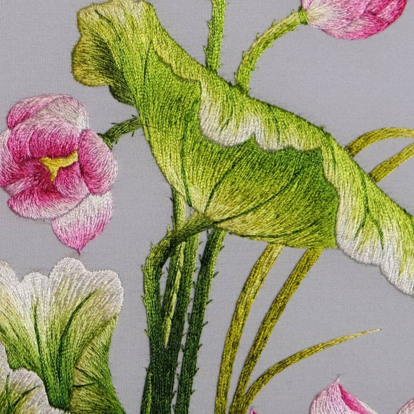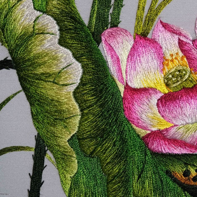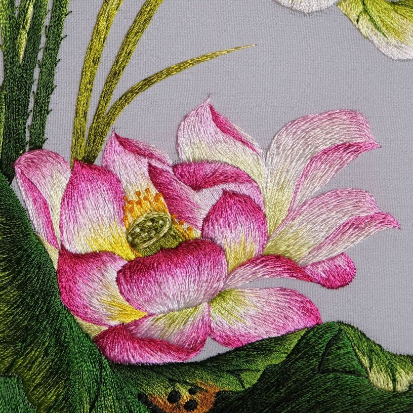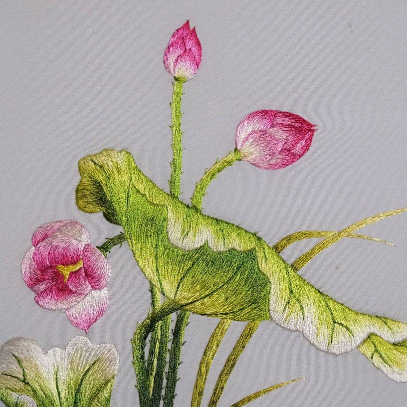 Đường nét thêu tay truyền thống được thể hiện một cách mượt mà, từ sự mềm dẻo của cánh hoa đến độ cong của lá sen. Đây không chỉ là một bức tranh thêu mà tựa như một bức họa tay, nơi màu sắc và chất liệu hòa quyện, tạo nên một tổng thể hòa hợp, đẹp mắt. Khả năng truyền tải cảm xúc và sâu sắc của bức tranh là không thể phủ nhận, khi mà chỉ cần ngắm nhìn là có thể cảm nhận được sự thư thái, lãng mạn nhờ vào kỹ thuật thêu tay điêu luyện và tỉ mỉ.