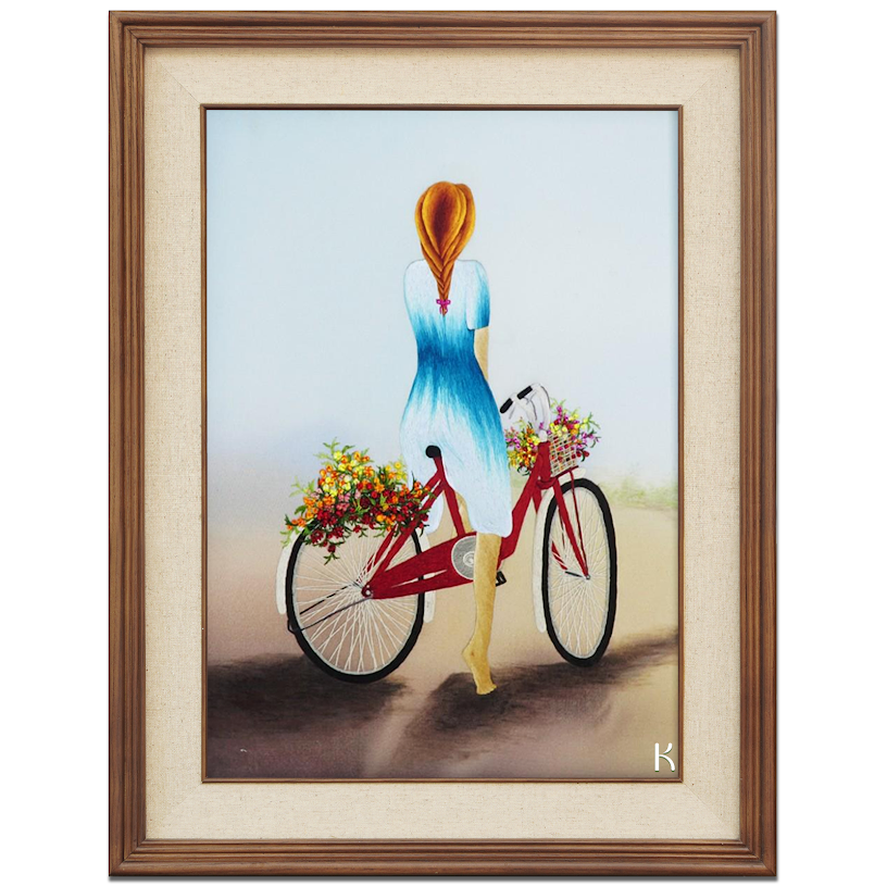 Khi nhìn kỹ hơn vào từng chi tiết, bạn sẽ thấy sự tài hoa trong từng sợi chỉ được thêu thủ công. Mái tóc đỏ rực của thiếu nữ được thả tự nhiên, lộng lẫy và đầy sức sống, như một biểu trưng cho tuổi trẻ và sắc đẹp. Những bông hoa rực rỡ sau xe đạp làm tăng thêm phần lãng mạn, ấm áp cho cả bức tranh.