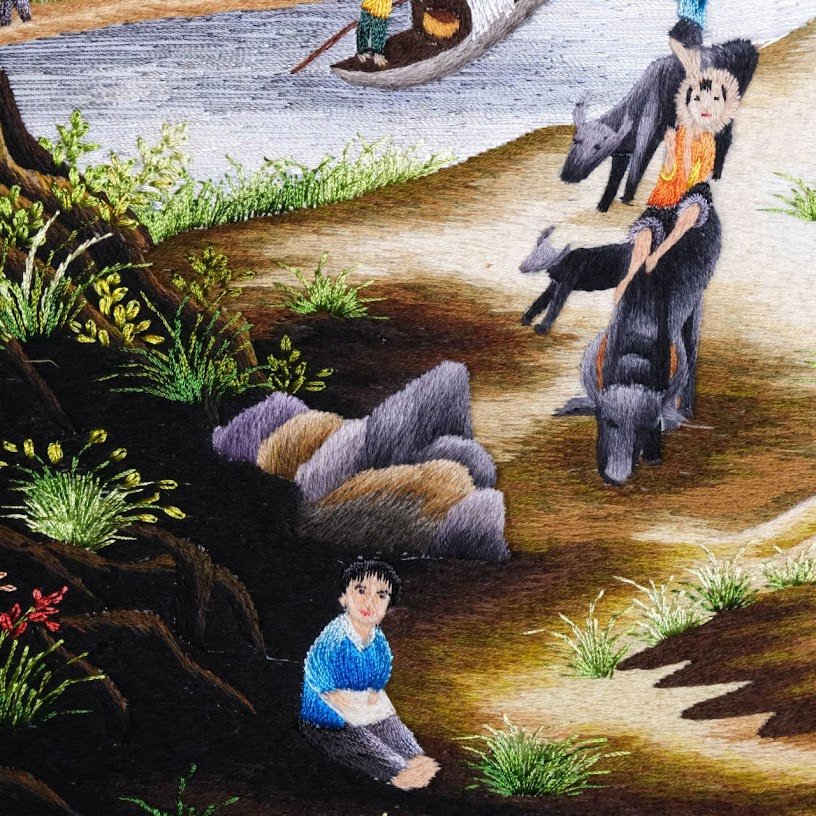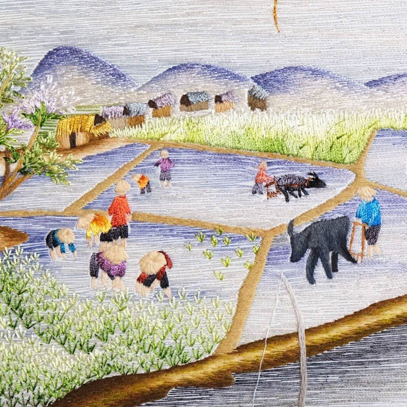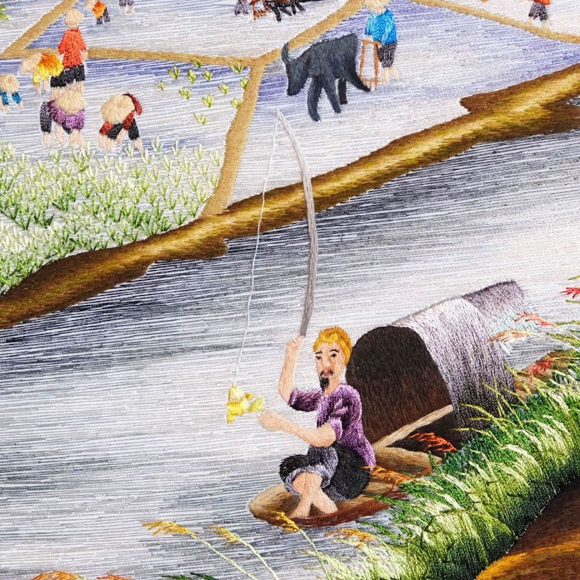 Kỹ thuật thêu tay truyền thống kết hợp hoàn hảo với nghệ thuật hội họa đã tạo nên tác phẩm đầy sức hút này. Không chỉ dừng lại ở những đường kim chỉ, mỗi mảng màu, mỗi chi tiết nhỏ đều được thổi hồn, tràn đầy sinh khí. Từ dáng hình những người phụ nữ gánh nước, cánh đồng lúa vàng ươm hay bầy trâu thong thả gặm cỏ, mọi thứ đều toát lên nét vui tươi, hòa bình một cách lạ thường.