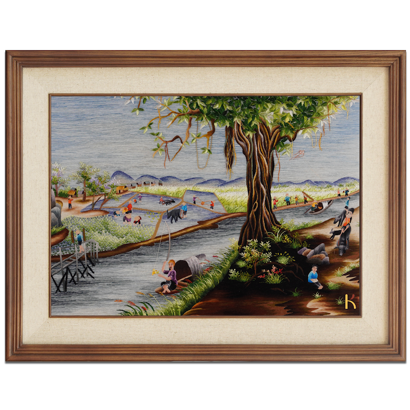 Vẻ đẹp quê nhà được khắc họa tinh tế trên từng sợi chỉ, từng đường kim mũi nhọn trong bức tranh thêu tay “Phong Cảnh Quê Hương.” Đây không chỉ là tác phẩm nghệ thuật mà còn là lời nhắc nhở dịu dàng về nơi chốn thân thương, nơi mà mỗi người Việt dù đi xa cũng luôn đau đáu nhớ về. Bức tranh mang trong mình giá trị văn hóa và tinh thần vô cùng to lớn, khi mà mỗi đường nét đều khắc sâu từng gam màu ký ức về tuổi thơ đồng quê tràn ngập niềm vui và yên bình.