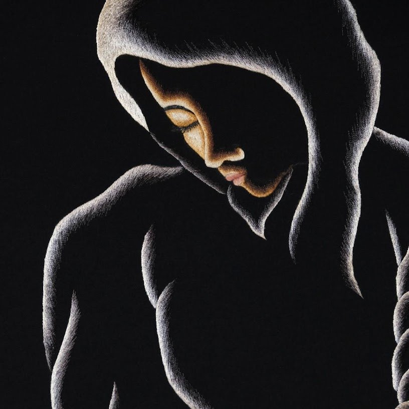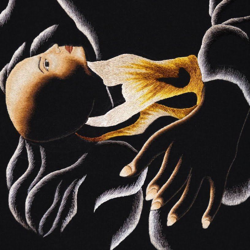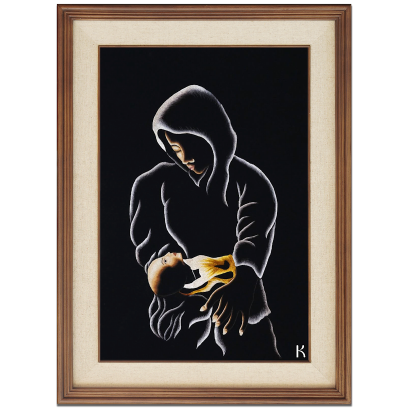 Bức tranh này đặc biệt bởi sự kết hợp giữa màu sắc tối giản và cách thể hiện đầy sâu lắng. Hình ảnh người mẹ nhẹ nhàng bồng bế đứa con nhỏ, đắm chìm trong giấc ngủ yên bình, được thể hiện một cách khéo léo qua những mũi thêu tỉ mỉ. Màu đen của phông nền làm nổi bật hình ảnh người mẹ và em bé, tạo nên sự tương phản mạnh mẽ nhưng vẫn giữ được nét mềm mại, dịu dàng vốn có.