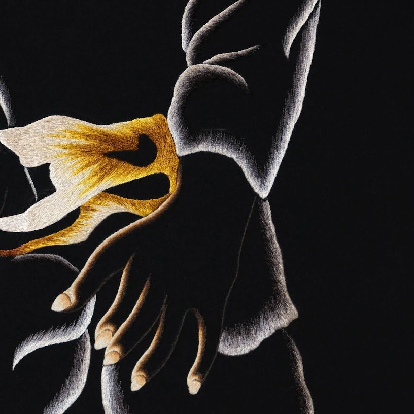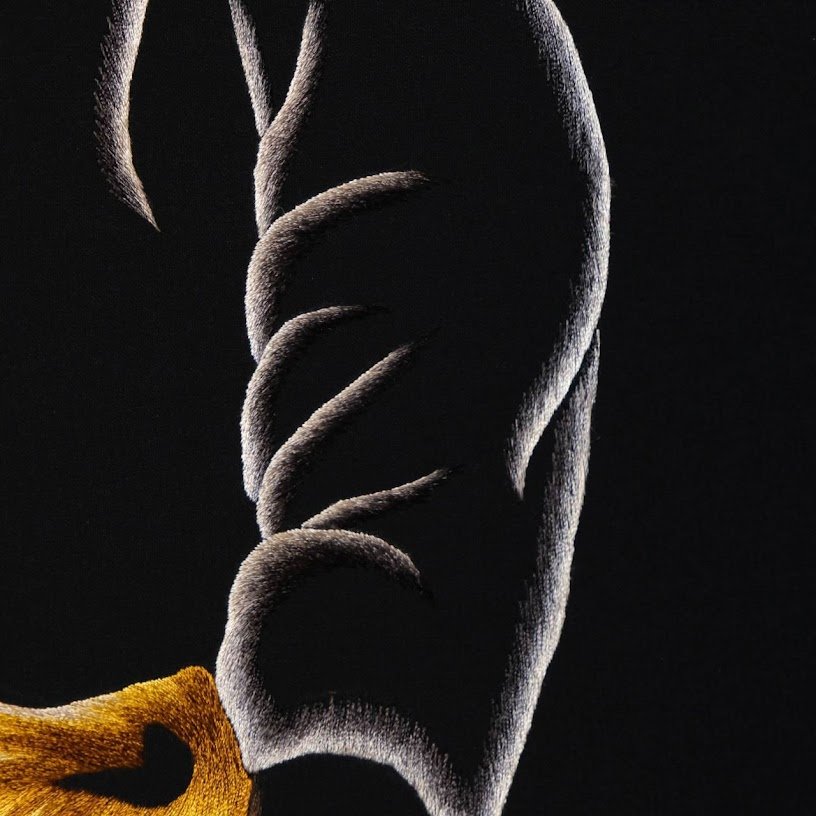 Về kỹ thuật thêu, nghệ nhân đã chọn những mũi thêu cơ bản nhưng được thực hiện một cách điêu luyện để tạo ra các sắc độ tinh tế. Những sợi chỉ trắng và đen phối hợp tạo hiệu ứng 3D, làm bức tranh có chiều sâu và nổi bật mạnh mẽ. Từng đường kim mang lại cảm giác hiện hữu sống động, giúp người xem cảm nhận rõ ràng hơn biểu cảm và hình dáng của các nhân vật.