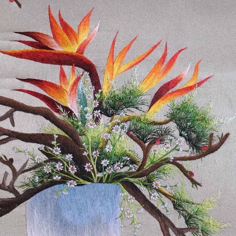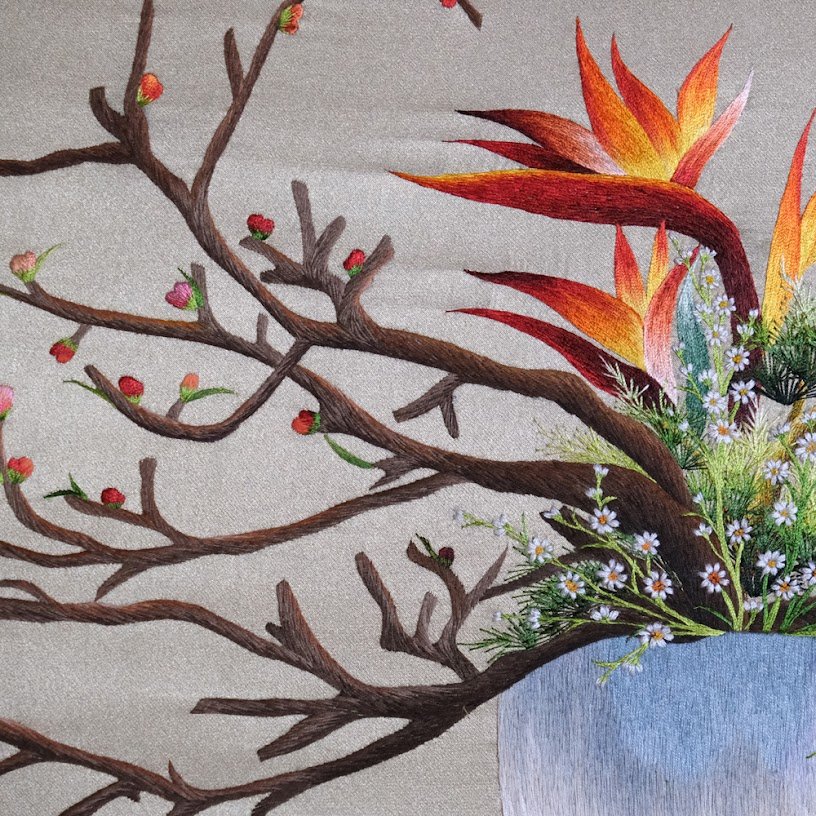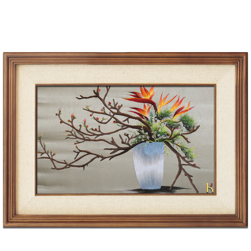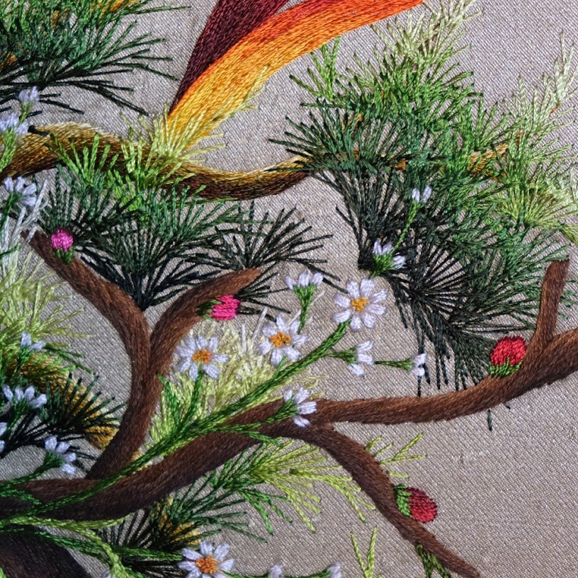 Bức tranh nổi bật với sự kết hợp hài hòa giữa những tone màu ấm áp như màu cam rực rỡ của hoa điểu hòa quyện cùng màu nâu tự nhiên của cành cây khẳng khiu. Màu sắc được phối hợp một cách khéo léo, đầy nghệ thuật, tạo ra một bức tranh sống động và cuốn hút. Chỉ nhìn qua lớp nền vải, bạn đã có thể cảm nhận được sự công phu, tỉ mỉ mà nghệ nhân đưa vào từng đường kim mũi chỉ. Đó không chỉ là khả năng nghệ thuật mà còn là cả một tâm huyết giữ gìn giá trị truyền thống đậm đà văn hóa dân tộc.