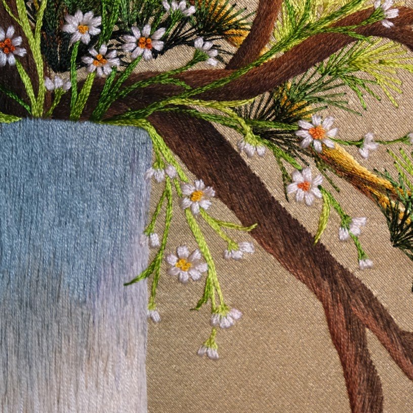Trên nền tranh, hình ảnh chiếc bình gốm xanh dịu dàng, thanh thoát, như một biểu tượng cho sức mạnh âm thầm nhưng vững chắc. Các nhánh cây đan xen, vươn lên kiêu hãnh như thể hiện sự kiên cường của con người miền cao nguyên, vượt lên khó khăn để sinh tồn và phát triển. Hoa điểu rực rỡ tựa như một thông điệp về sự sinh sôi, hy vọng và sức sống mãnh liệt giữa thiên nhiên hoang dã.