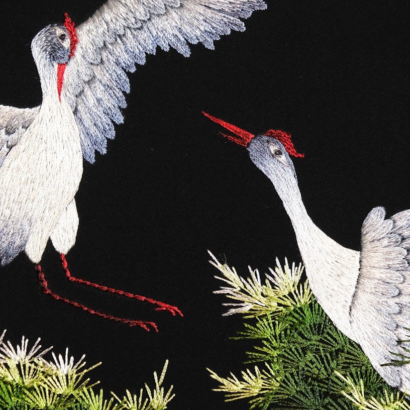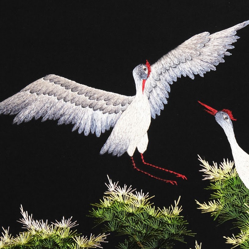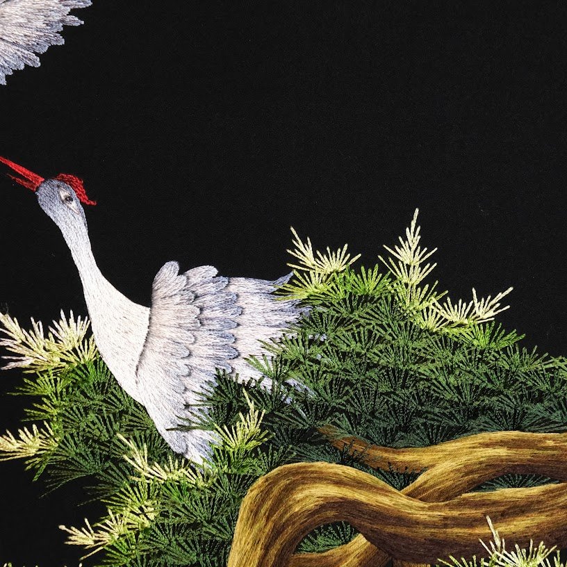 Bức tranh lôi cuốn ngay từ ánh nhìn đầu tiên với hình ảnh hai chú hạc trắng đang duyên dáng đậu trên cành tùng, mỗi nét thêu đều tinh tế đến từng chi tiết. Màu trắng tinh khôi của những chú hạc nổi bật trên nền đen sâu thẳm, tạo nên một tổng thể kịch tính nhưng hài hòa. Bộ lông trắng của hạc dường như phát sáng, làm bật lên vẻ tinh khiết, thanh cao của loài chim quý này. Đôi mắt đỏ sắc sảo, chân thực của hạc góp phần tăng thêm sức sống động, gần gũi cho bức tranh.