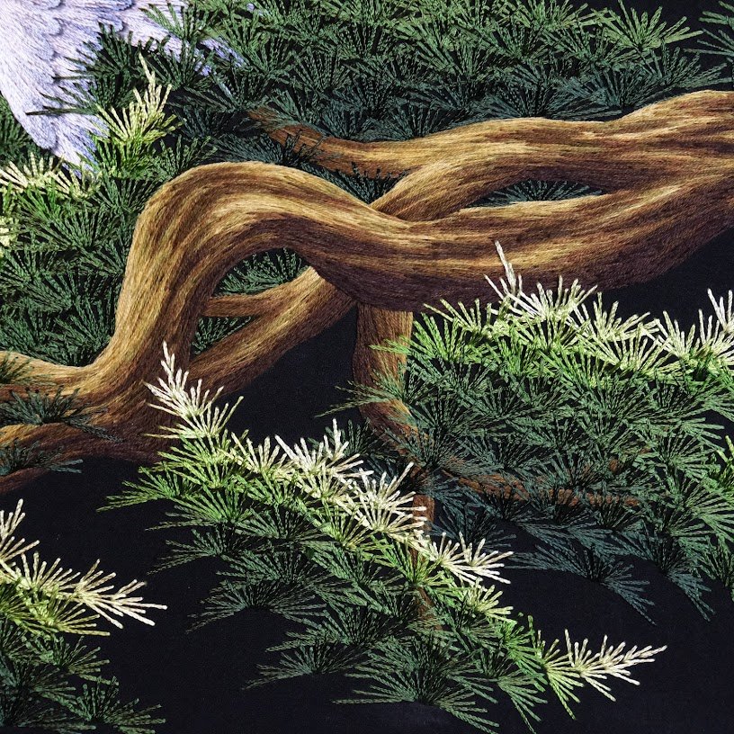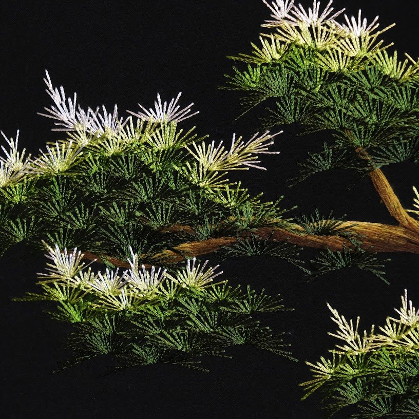 Cành tùng xanh ngát vươn dài, với những mũi kim thêu hình lá tỉ mỉ, thể hiện sự kiên cường và bền bỉ. Màu xanh của tùng không đồng nhất mà biến đổi từ những sắc thái đậm nhạt, tạo nên cảm giác mềm mại và tự nhiên. Thân cây uốn lượn, vặn mình, trông như đang nép mình vào không gian rộng lớn mà bức tranh mở ra.